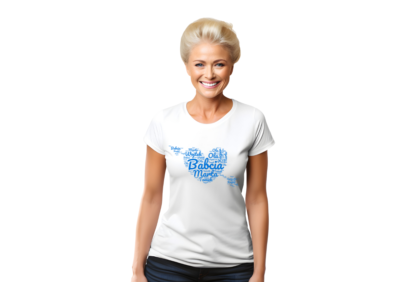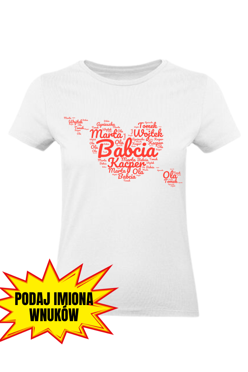 Koszulka damska "Babcia w Sercu" to piękny prezent na Dzień Babci! Nadruk przedstawia duże serce z napisem "Babcia" w środku, otoczonym imionami wnuków. Dodatkowo, możesz wybrać dowolny kolor serca, by jeszcze bardziej dopasować koszulkę do gustu Babci. To wzruszający i wyjątkowy sposób, by wyrazić miłość i wdzięczność!