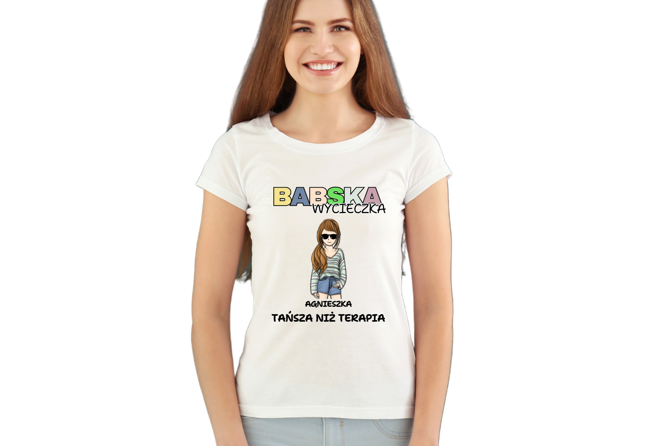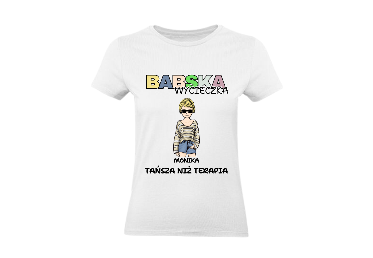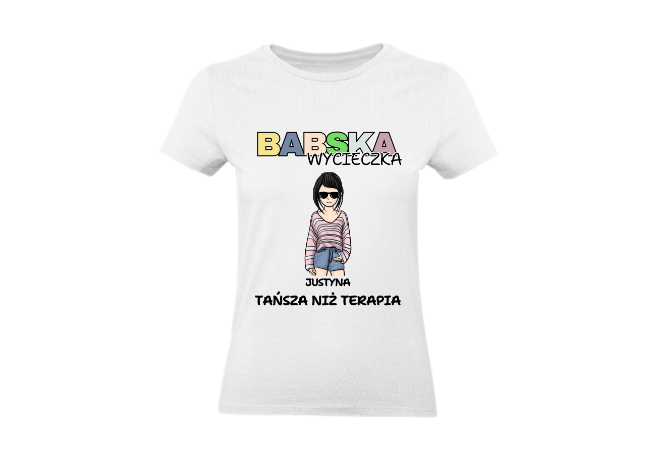 Koszulka "Babska Wycieczka Tańsza niż Terapia" to idealna pamiątka na babskie wypady! Spersonalizuj postać na koszulce, wybierając długość i kolor włosów, kolor bluzeczki oraz dodając imię. Wyraź swoją wyjątkowość i ciesz się wspomnieniami!