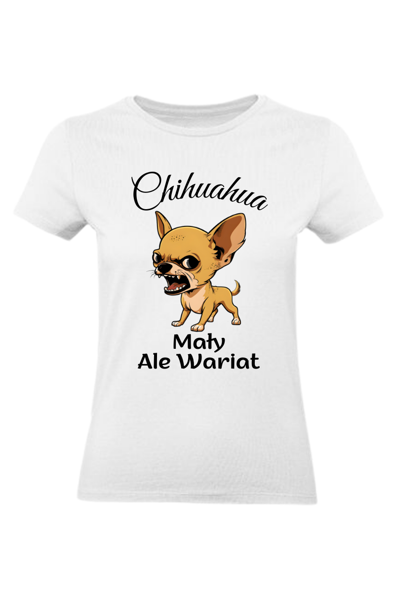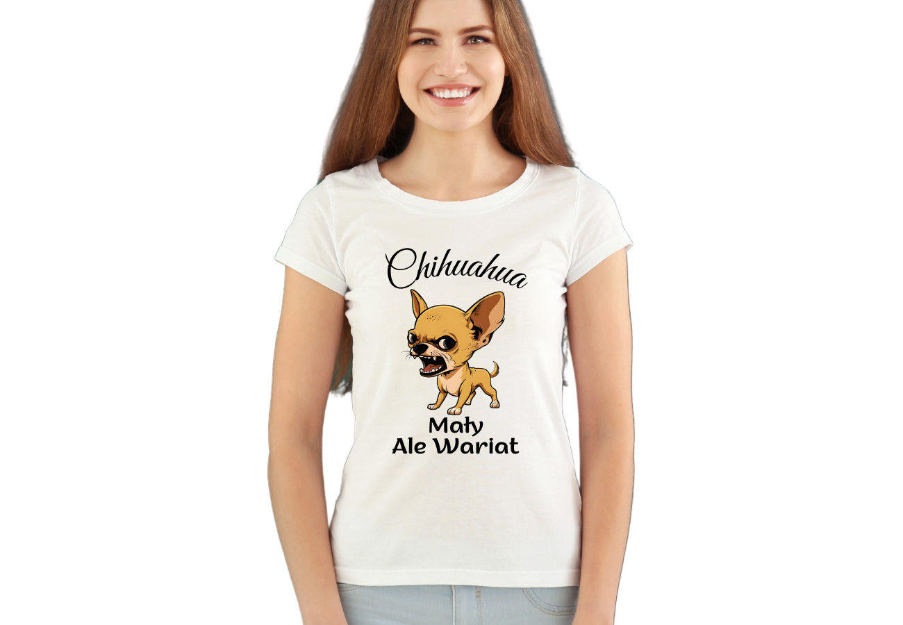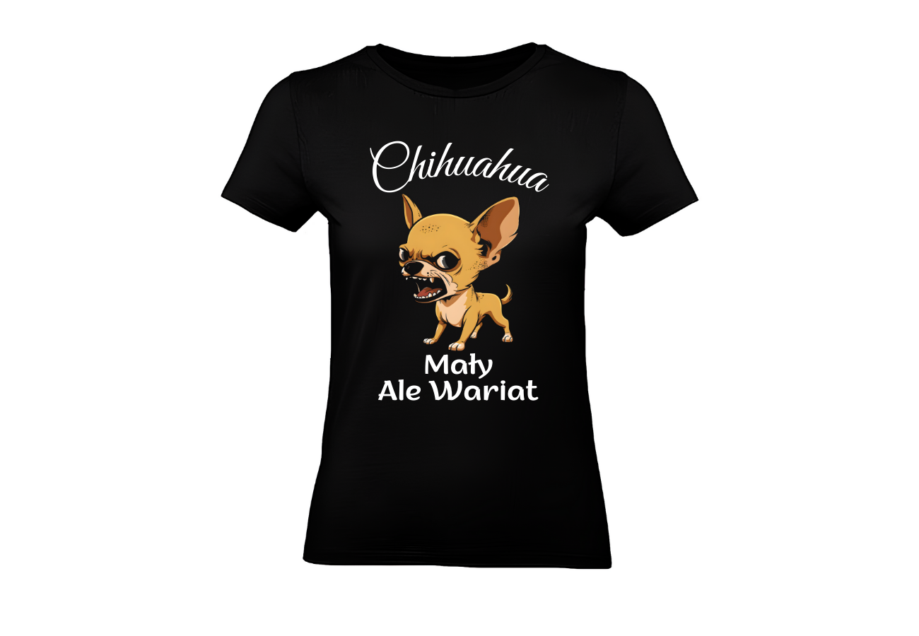 Koszulka "Chihuahua Mały ale Wariat" to wyraz Twojego poczucia humoru i miłości do tych małych, energicznych psiaków! Z uroczym wizerunkiem Chihuahuy, ta koszulka dodaje koloru i radości Twojemu stylowi.