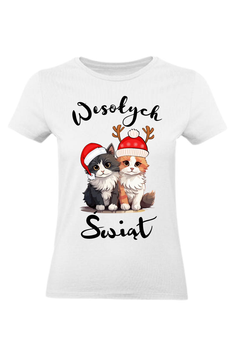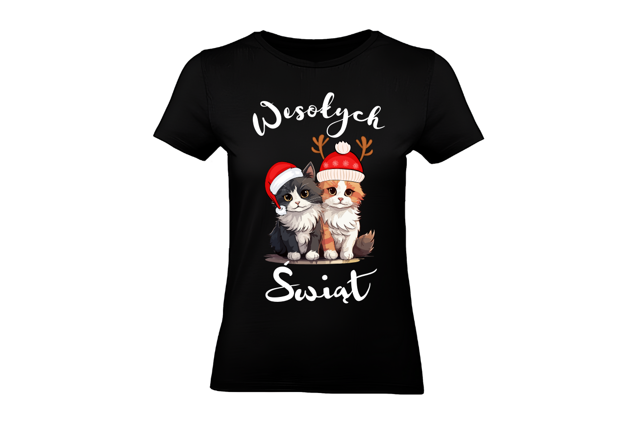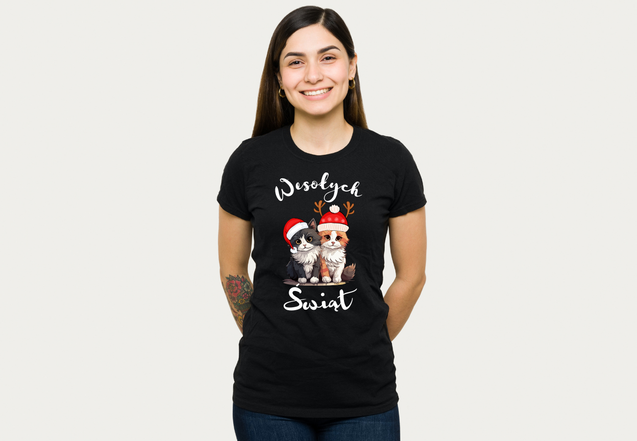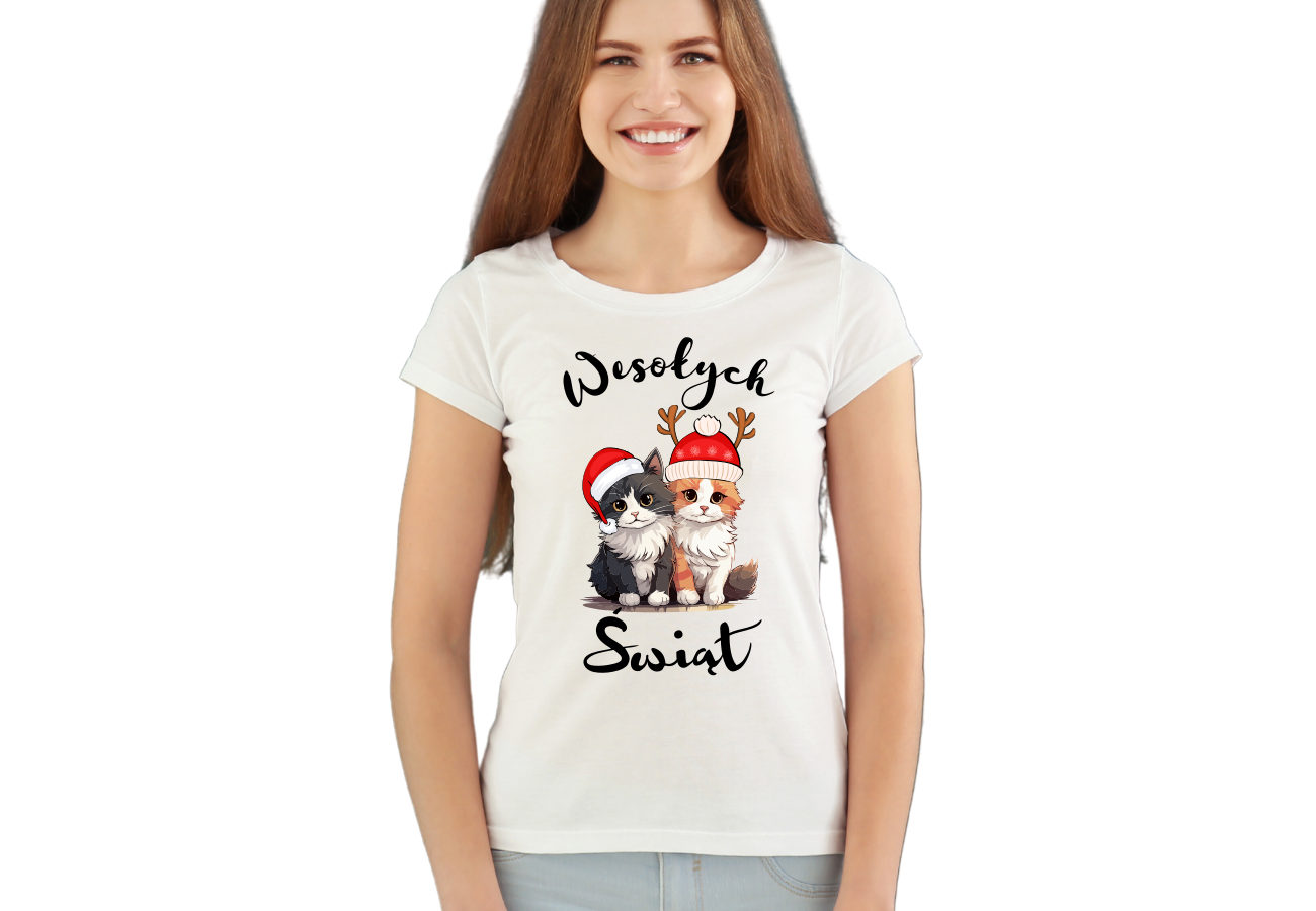 Koszulka Damska "Dwa Koty - Wesołych Świąt" to uroczy i humorystyczny sposób na świętowanie okresu świątecznego. Ta koszulka przedstawia dwa kocury, które doskonale oddają atmosferę radości i zabawy podczas świąt. To ubranie, które wyraża twój świąteczny nastrój i poczucie humoru. Teraz możesz świętować wesołe święta w jeszcze bardziej uroczym stylu!