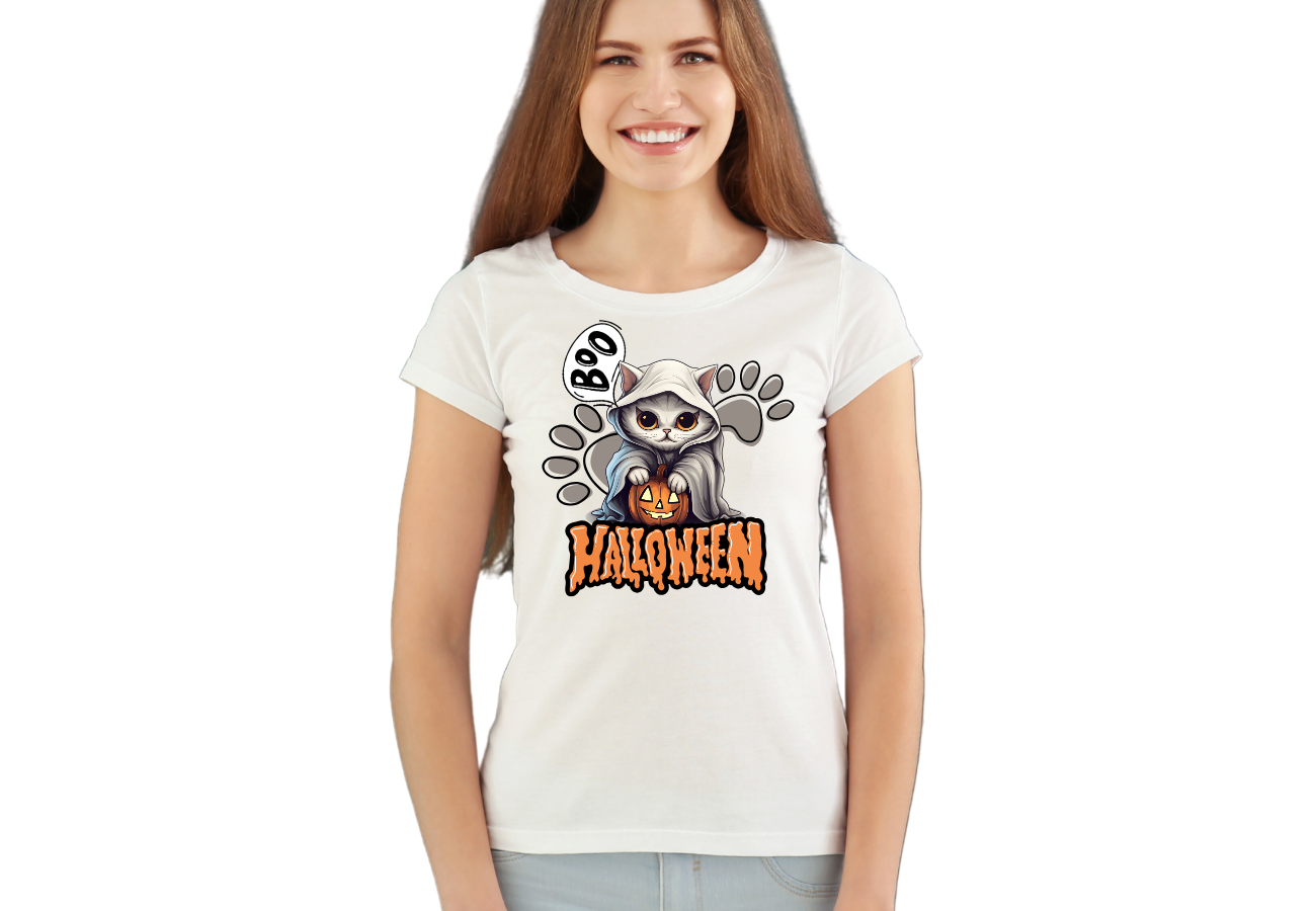 Koszulka "Halloween Kot Duch" to mieszanka uroku i tajemniczości, gdy kot w duchowym przebraniu wprowadza w niesamowity nastrój tego święta. Ta koszulka doskonale oddaje ducha Halloween, dodając odrobinę kociego uroku. Gotowy na noc pełną duchów? Happy Halloween!