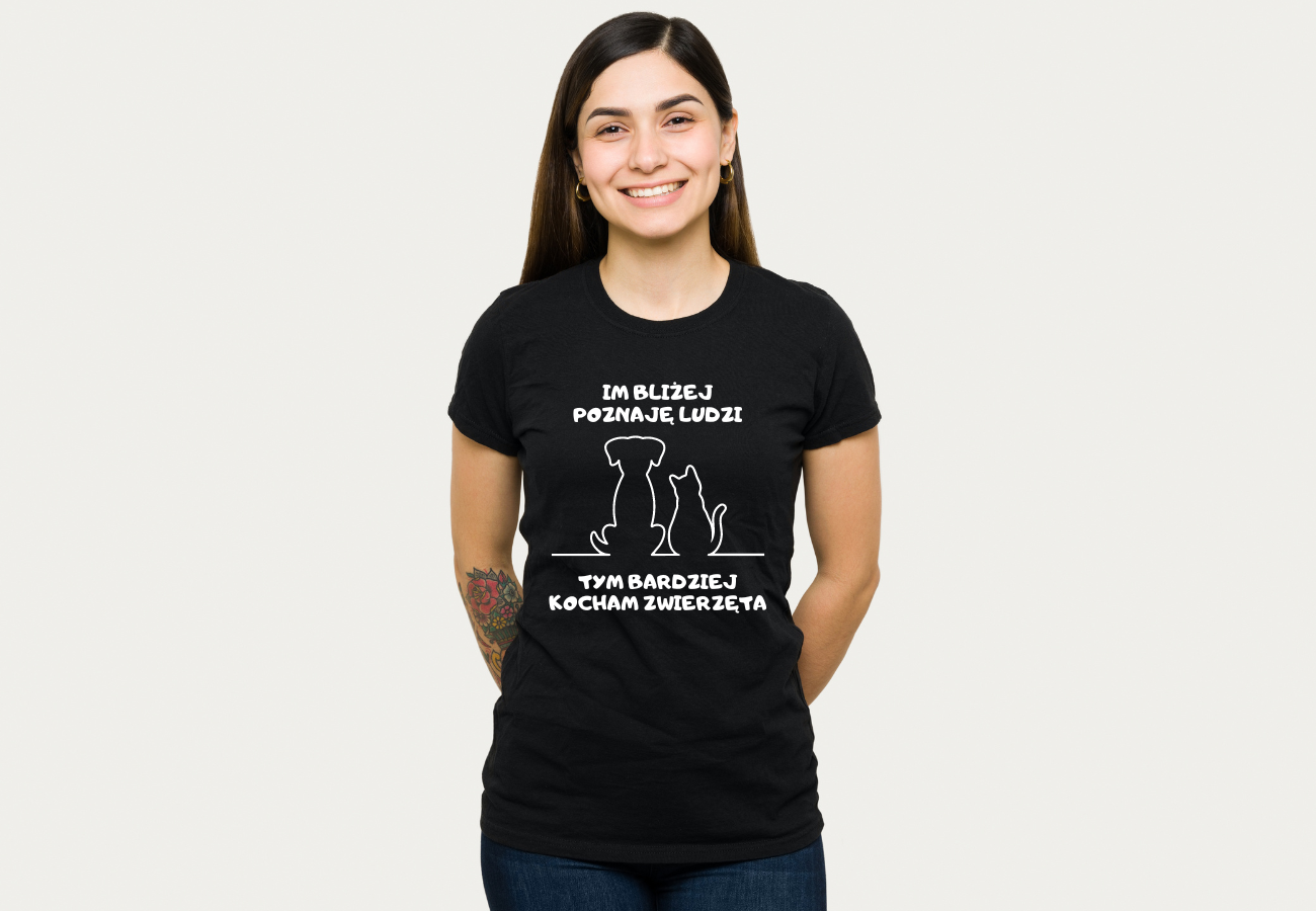 Koszulka "Im Bliżej Poznaję Ludzi, Tym Bardziej Kocham Zwierzęta" to doskonały sposób na wyrażenie miłości do zwierząt. Ten humorystyczny napis sprawia, że koszulka jest idealna na co dzień. Pokaż, jak bardzo cenisz swoje futrzane towarzystwo!