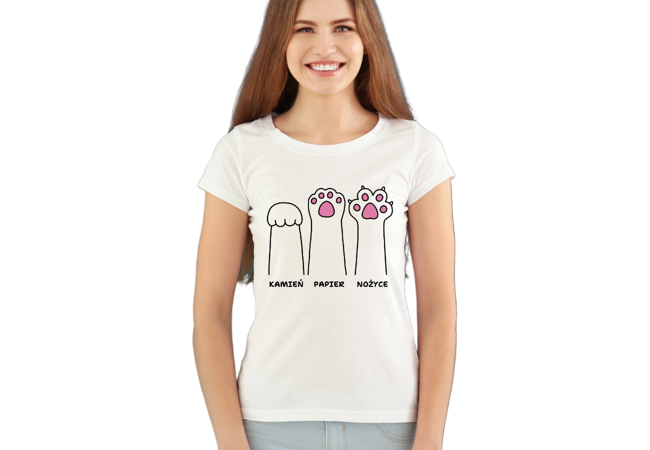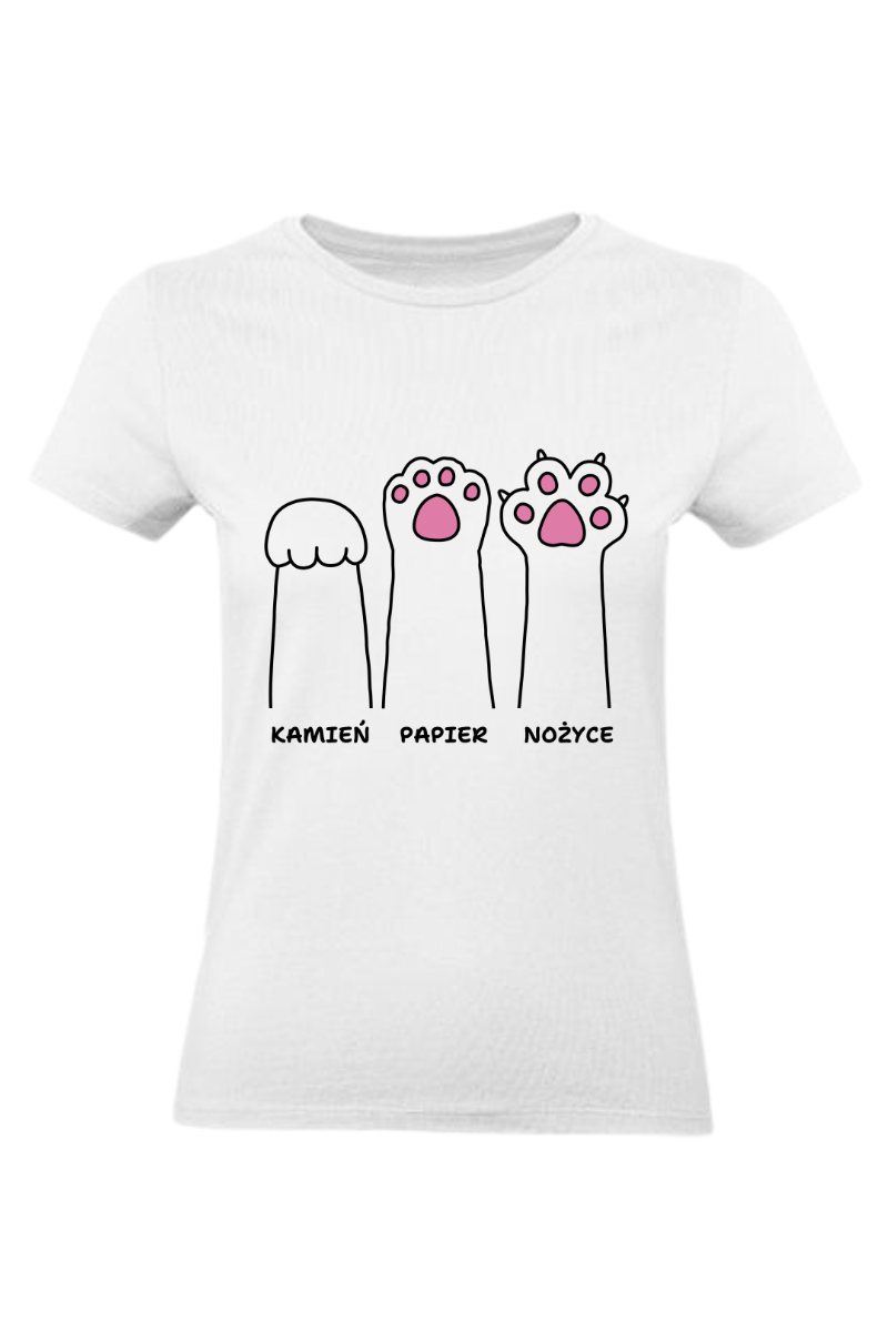 Koszulka Damska "Kocie Łapy Kamień, Papier, Nożyce" to kreatywna interpretacja znanej gry. Wybierz swój ruch z uroczymi kocimi łapkami i dodaj odrobinę humoru do swojego stylu. Zabawa zawsze w zasięgu twoich dłoni!