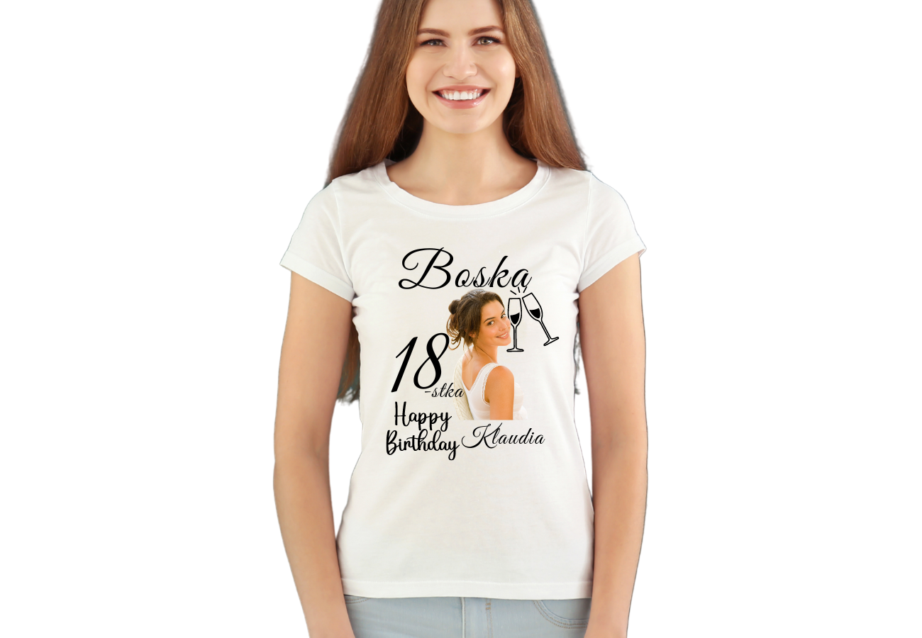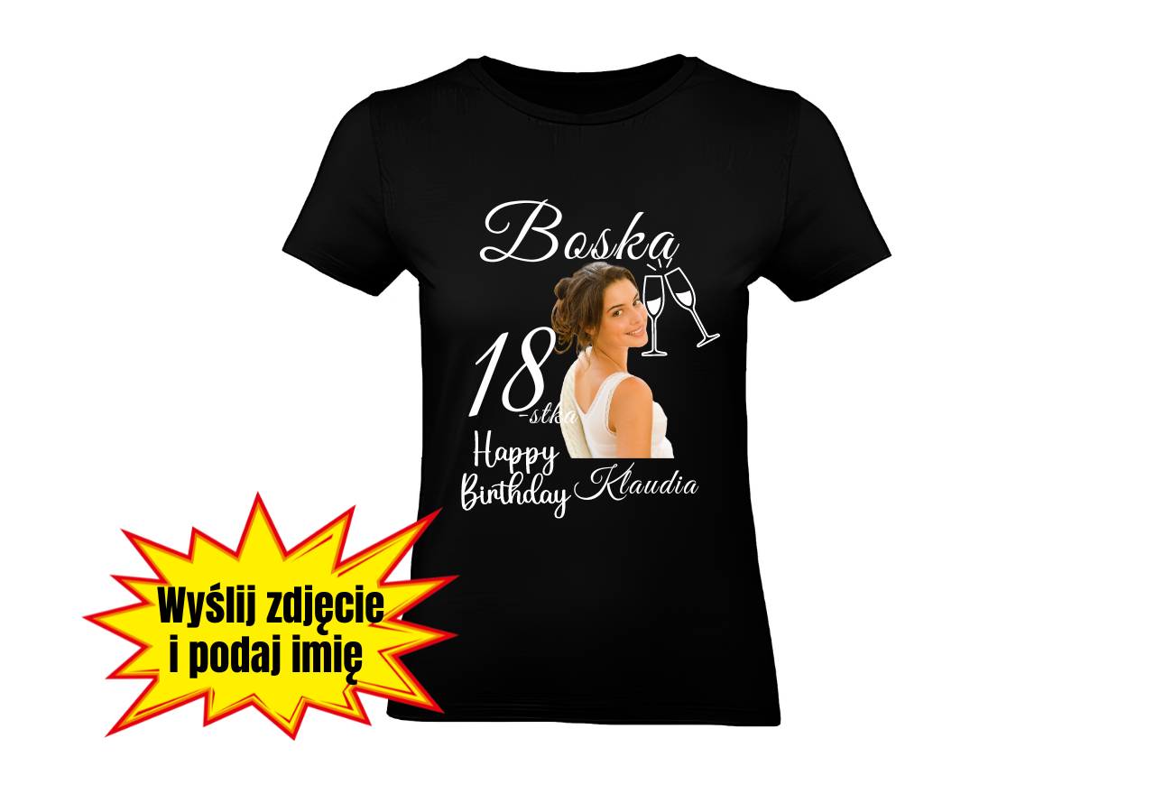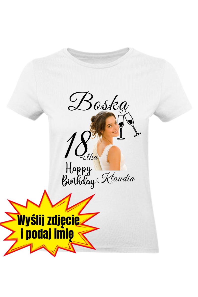 Koszulka Damska na Urodziny "Boska 18-stka" to doskonały prezent na osiemnastkę! Spersonalizuj ją, dodając imię solenizantki i przesyłając zdjęcie, które znajdzie się na koszulce. Wyjątkowy sposób na uczczenie tego ważnego dnia!
