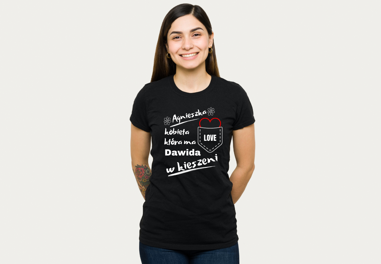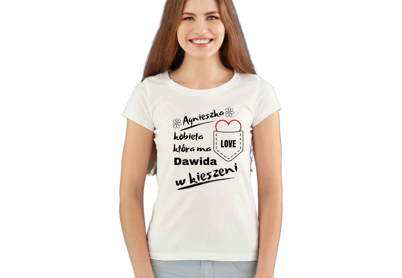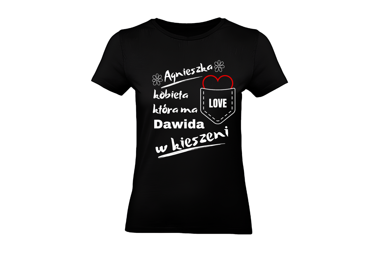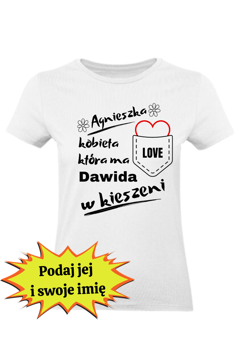 Koszulka Damska na Walentynki: "Kobieta, która ma Chłopaka w Kieszeni". Podaj swoje i jej imię, dodając osobisty akcent do romantycznej atmosfery. Wyraź swoją miłość w wyjątkowy sposób z tą spersonalizowaną koszulką na Walentynki!
