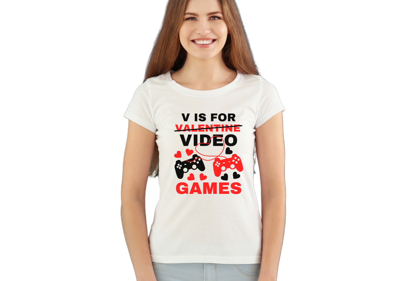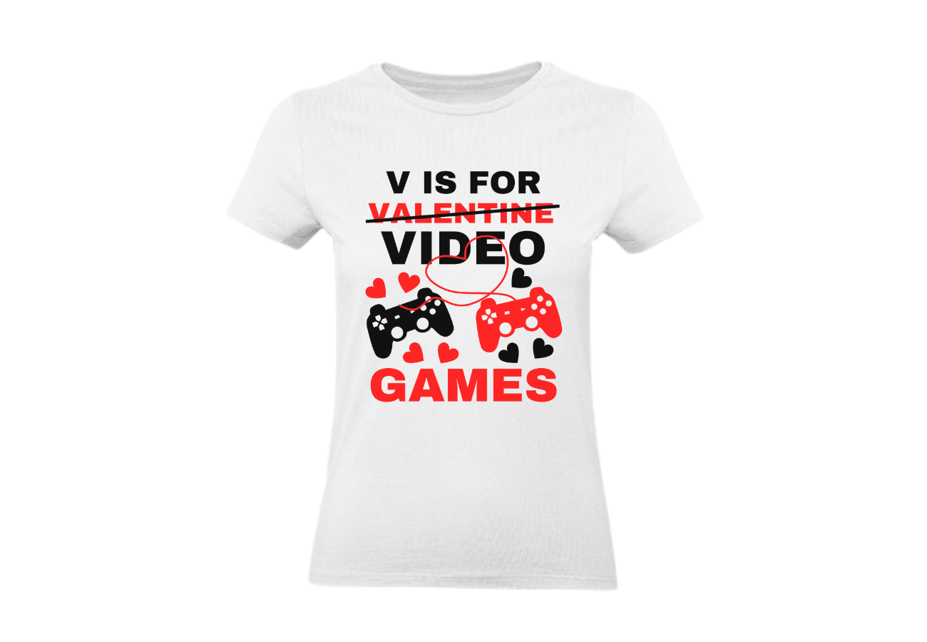 Koszulka na Walentynki: "V is for Video Games". Dla tych, którzy wolą joystick od kwiatów. Wyraź swoją miłość do gier wideo w wyjątkowy sposób z tą kreatywną koszulką na Walentynki