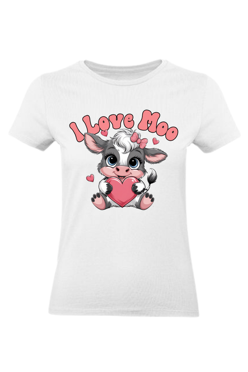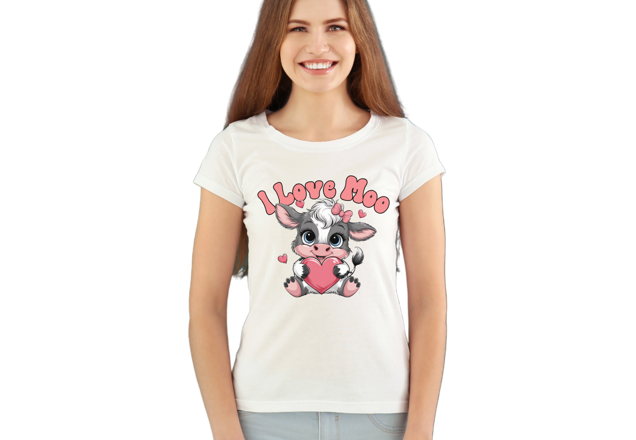 Koszulka damska na Walentynki "I Love Moo" to uroczy i zabawny prezent dla miłośniczek zwierząt! Nadruk z uroczą krówką i grą słów dodaje romantycznego i humorystycznego akcentu. Idealna na prezent dla ukochanej osoby lub samej siebie!