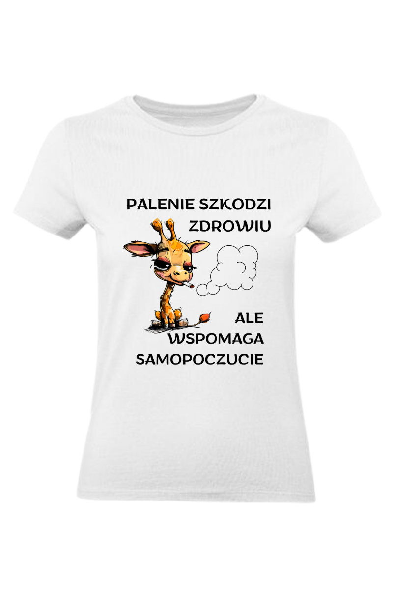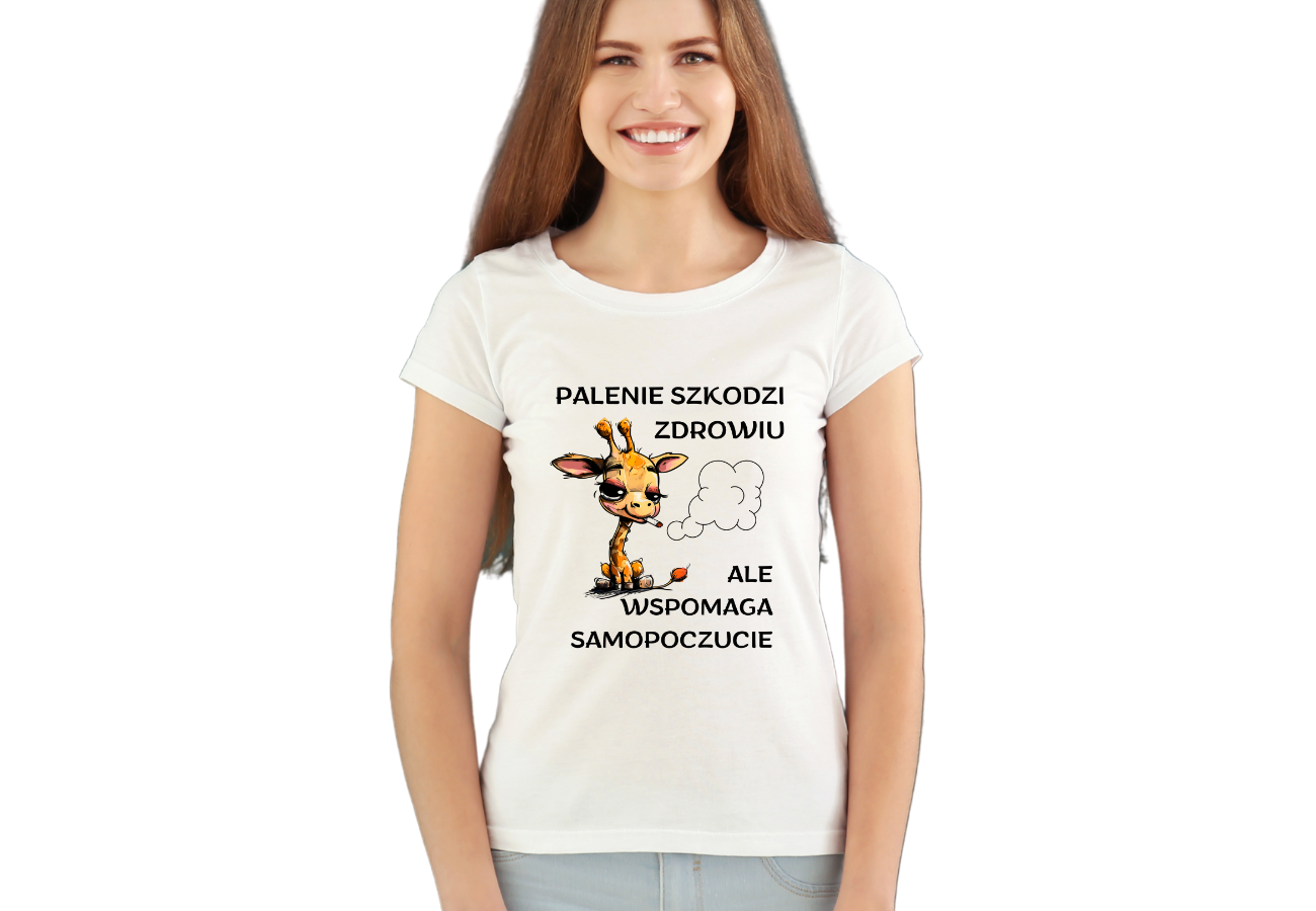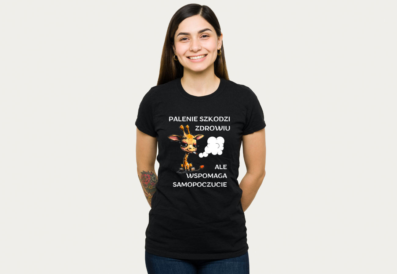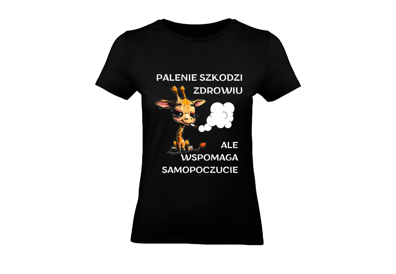 Koszulka z zabawną żyrafą i napisem "Palenie Szkodzi Zdrowiu, Ale Wspomaga Samopoczucie" to czysta dawka humoru i ironii! Z uśmiechniętą żyrafą, podkreślasz swój lekki stosunek do życia i zdolność do znajdowania radości w codziennych sytuacjach.