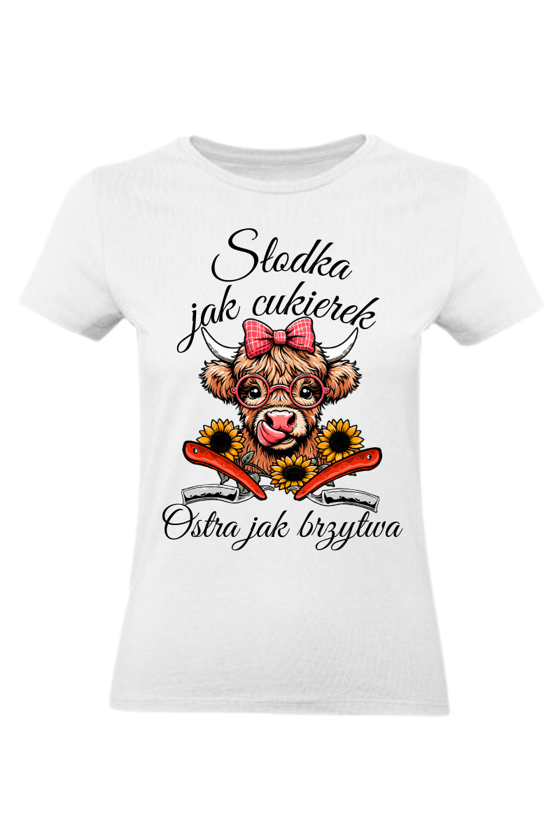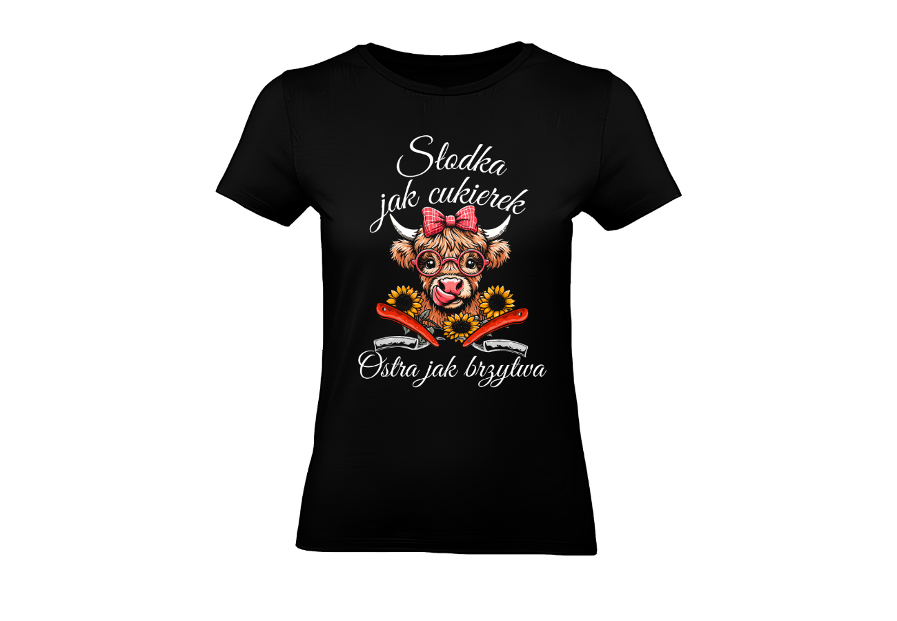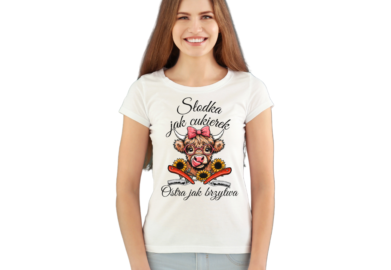 Koszulka "Słodka jak cukierek, ostra jak brzytwa" to połączenie słodyczy i ostrości! Z uroczym wizerunkiem słodkiej krówki, dwiema brzytwami obok, wyrażasz swój wyjątkowy styl i poczucie humoru. Gotowa na każdą sytuację, ta koszulka na pewno wyróżni cię z tłumu!