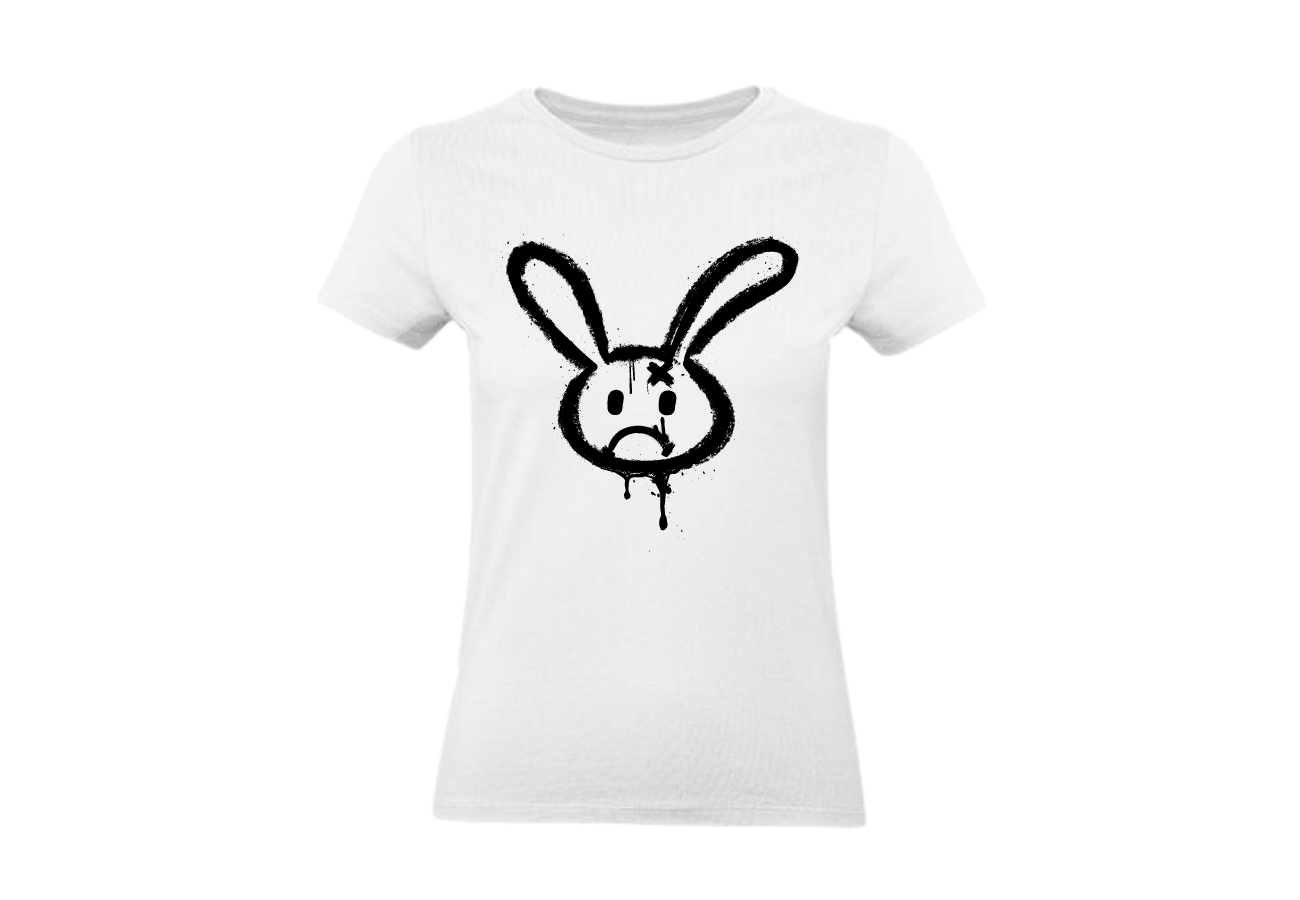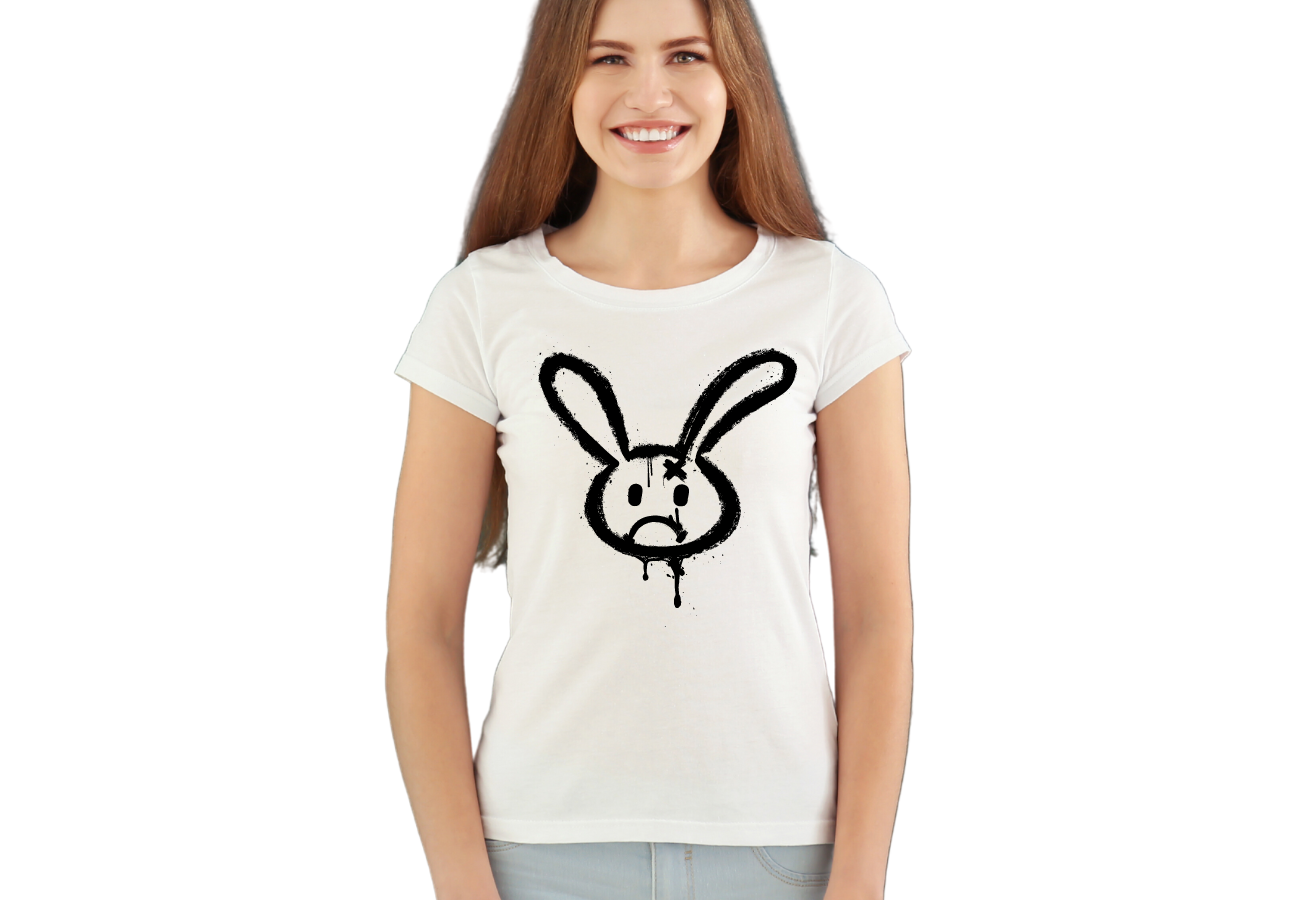 Koszulka Damska "Smutny Królik Graffiti" to unikalna forma wyrazu artystycznego. Zanuć nastrój i styl z tym smutnym królikiem w klimacie graffiti. Dodaj szczyptę tajemniczości do swojej garderoby!