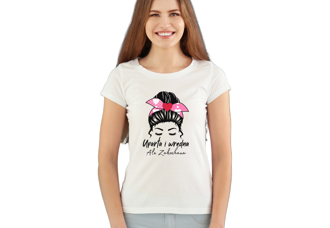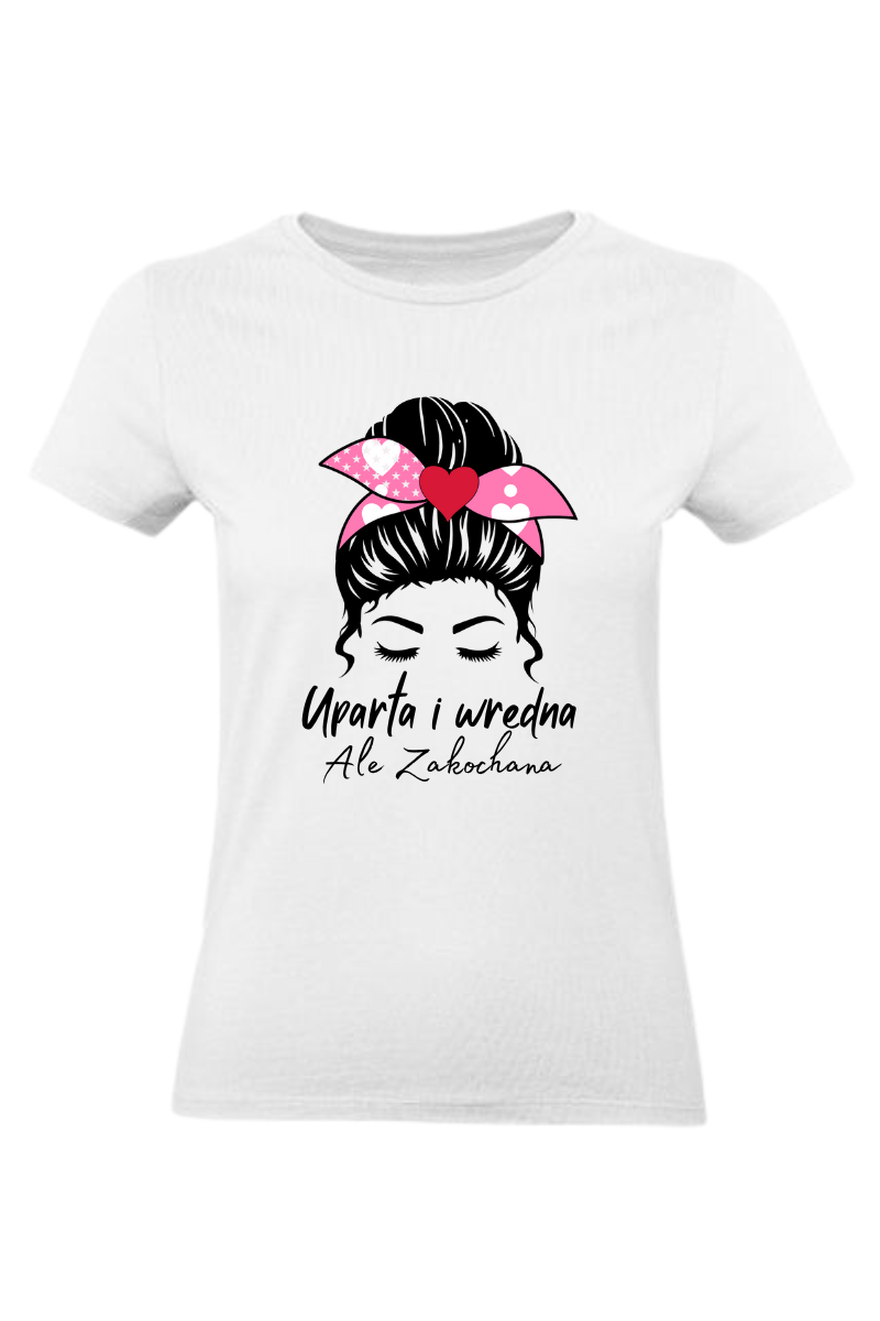 Koszulka Damska "Uparta i Wredna, Ale Zakochana". Wyraź swoją osobowość i jednocześnie czar miłości z tą oryginalną koszulką. Idealna dla tych, którzy kochają z pasją i dystansem!