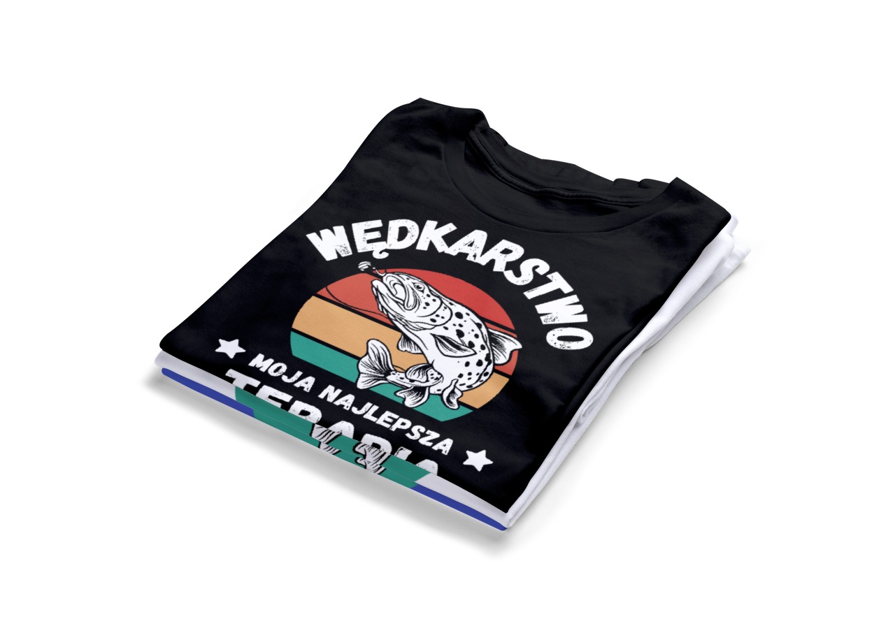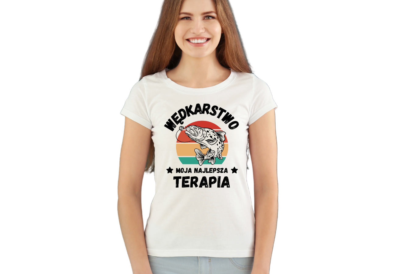 Koszulka "Wędkarstwo - Moja Najlepsza Terapia" Z uroczą rybką i napisem mówiącym wszystko. Jeśli potrzebujesz ucieczki od codzienności i chcesz pokazać, że najlepszym lekarstwem na stres jest spotkanie z wodą i wędką, to ta koszulka jest dla Ciebie!