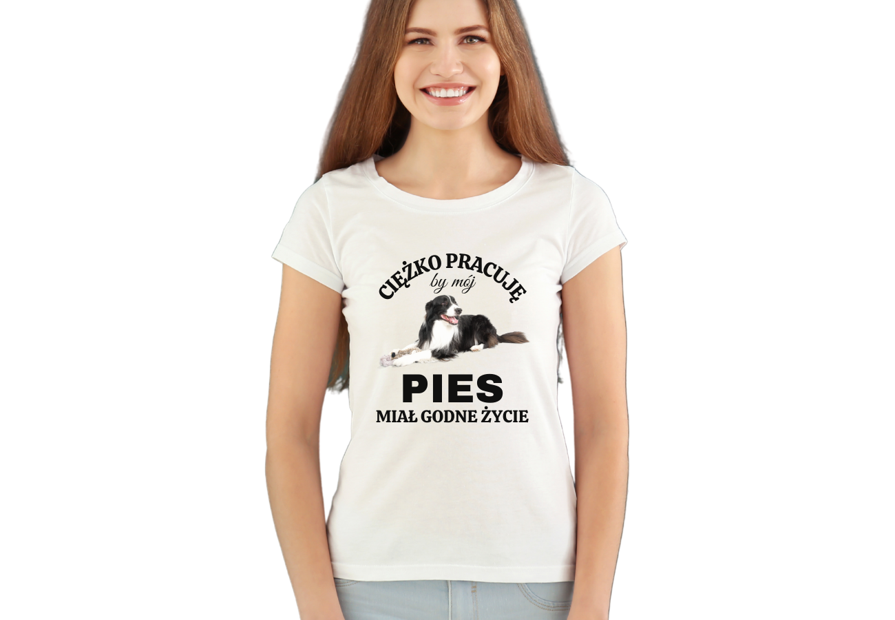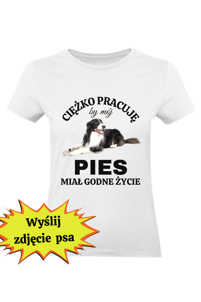 Twój pies na naszej koszulce? To możliwe! Wyślij zdjęcie swojego pupila, a my zrobimy z niego wyjątkową koszulkę z napisem "Ciężko Pracuję by mój Pies Miał Godne Życie".