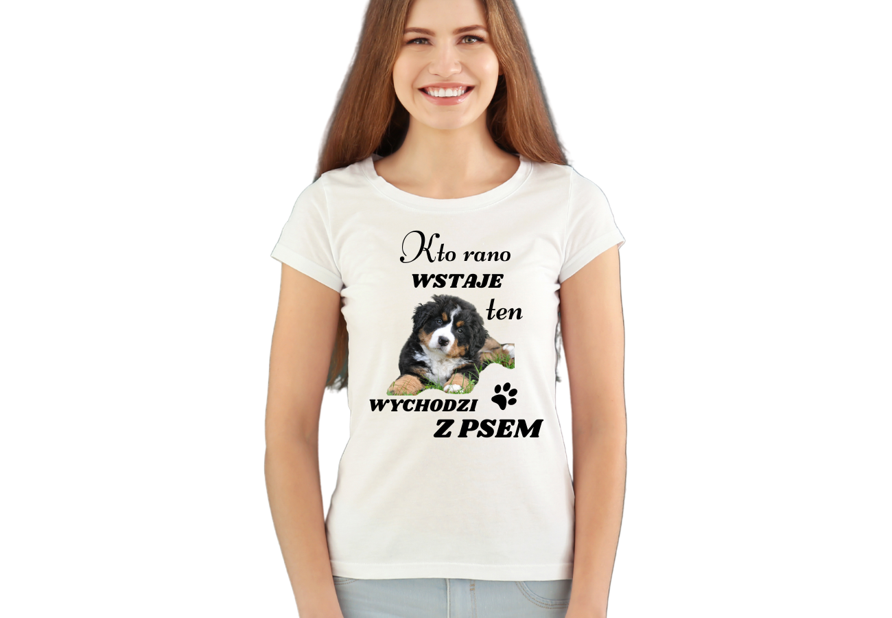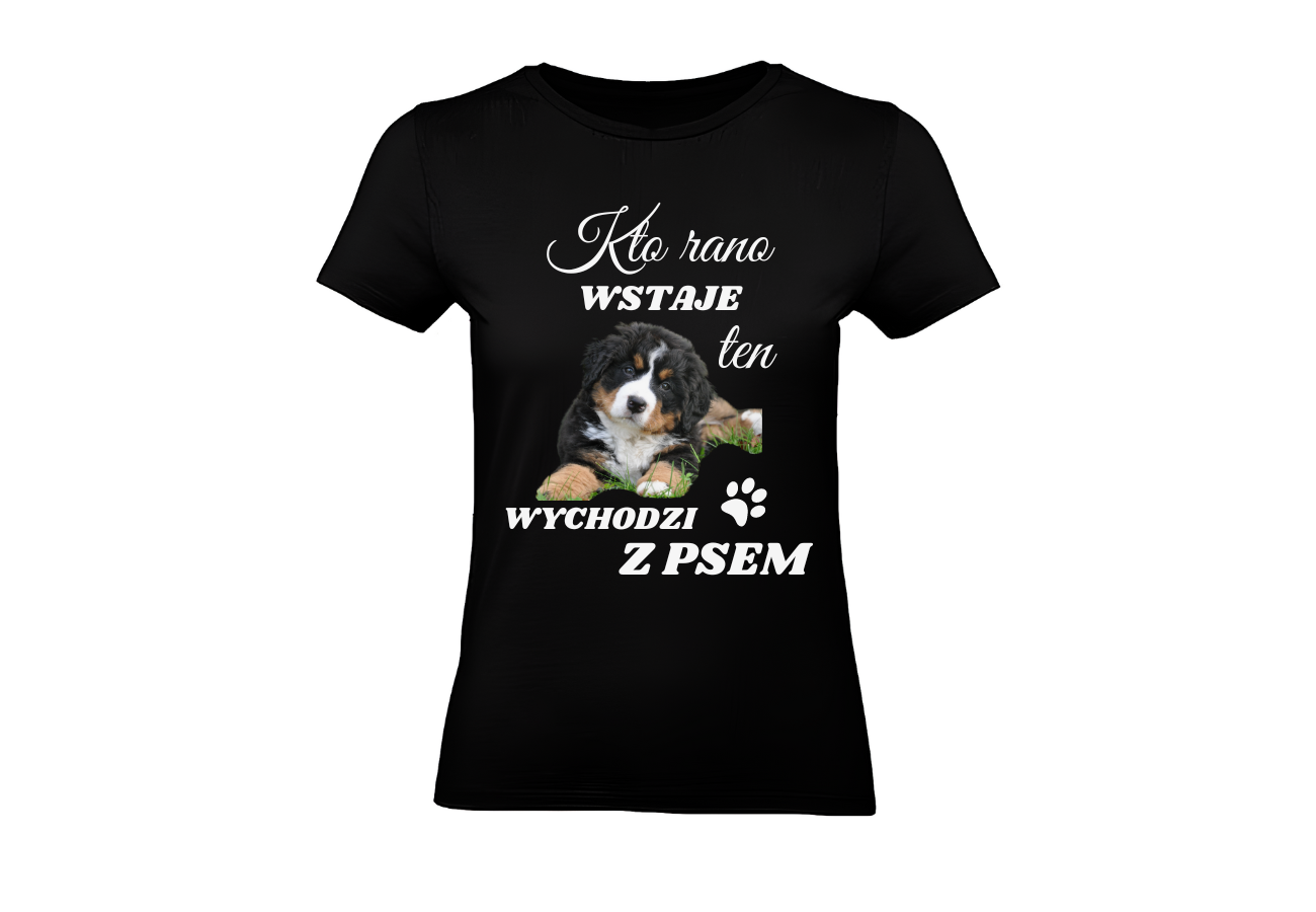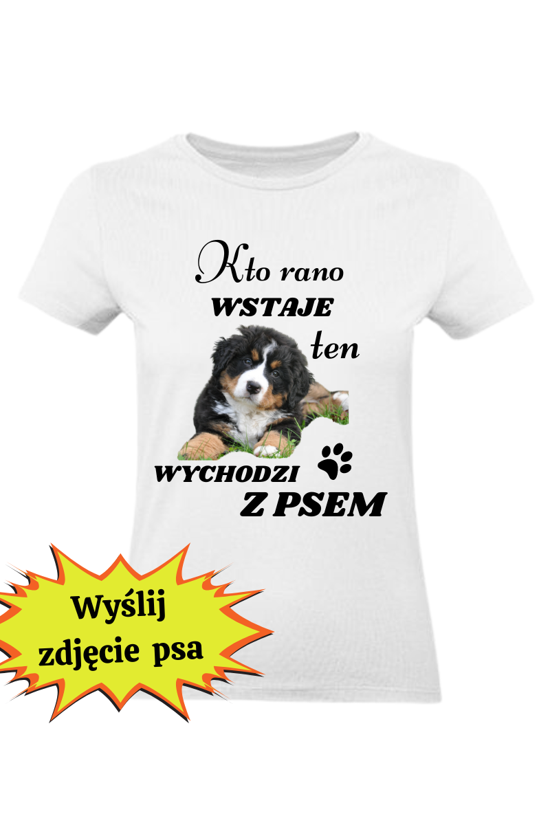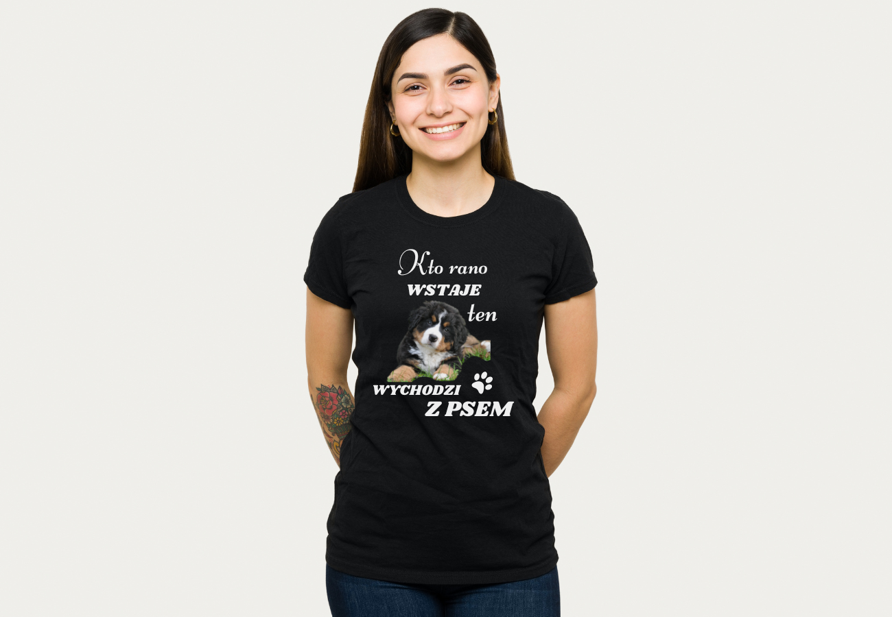 Twój pies na naszej koszulce? To możliwe! Wyślij zdjęcie swojego pupila, a my zrobimy z niego wyjątkową koszulkę z napisem "Kto Rano Wstaje Ten Wychodzi z Psem".