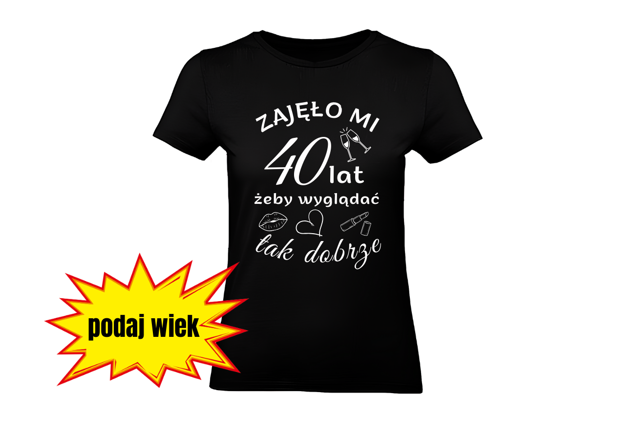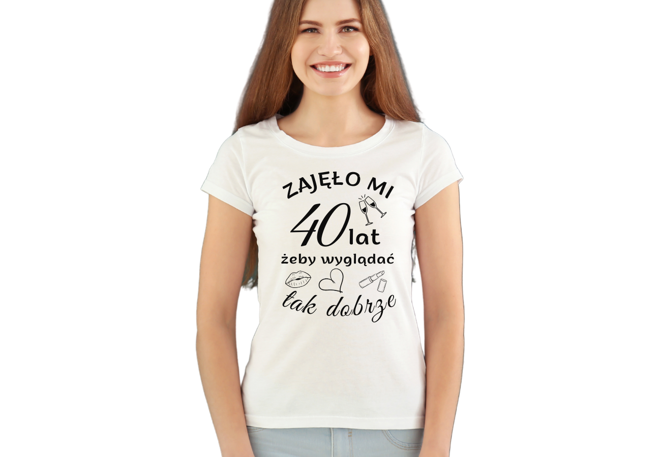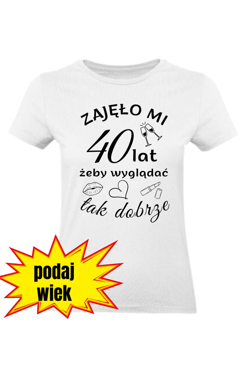 Koszulka Damska "Zajęło mi 40 lat, żeby wyglądać tak dobrze" to idealny prezent na okrągłe urodziny! Możesz spersonalizować koszulkę, podając inny wiek, który zostanie umieszczony na nadruku. Podaruj bliskiej osobie wyjątkowy upominek, który podkreśli jej styl i lata!