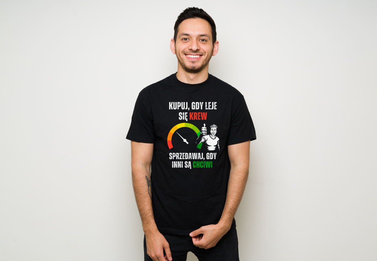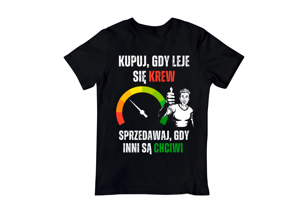 Koszulka "Kupuj, gdy leje się krew, Sprzedawaj, gdy inni są chciwi" to idealny wybór dla inwestora. Z humorem oddaje zasady giełdowej strategii, pokazując Twoją finansową mądrość i odwagę w inwestowaniu. Pokaż, że rozumiesz rynkowe trendy i nie boisz się ryzykować!