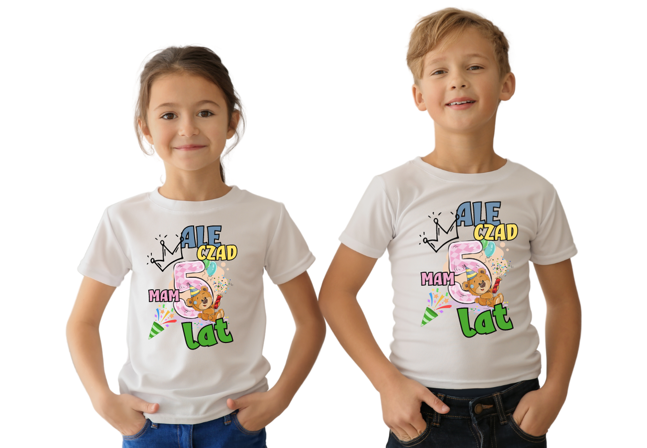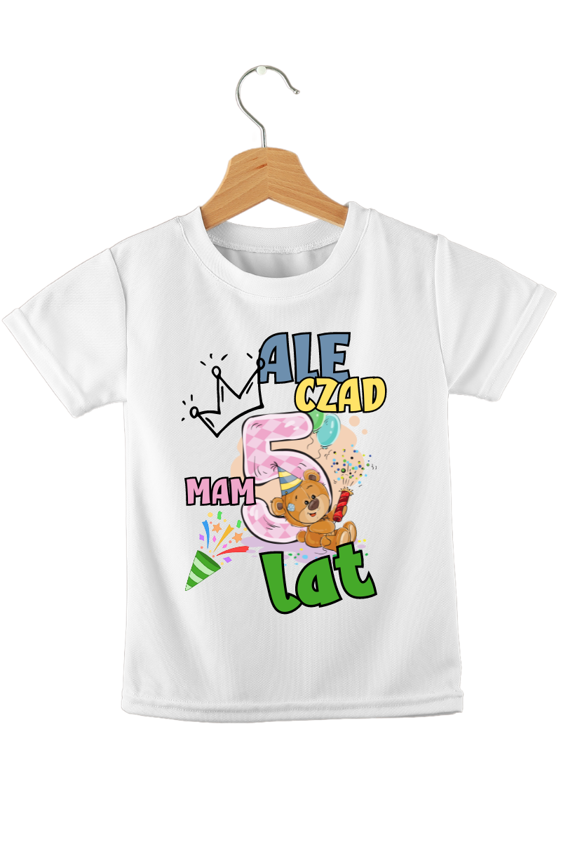 Koszulka "Ale Czad, Mam 5 Lat" to idealna koszulka dla małego jubilata. Zabawna i kolorowa grafika z dumą oznajmia osiągnięcie ważnego kamienia milowego w życiu dziecka. Doskonały prezent, który uczyni jego 5 urodziny jeszcze bardziej wyjątkowymi.