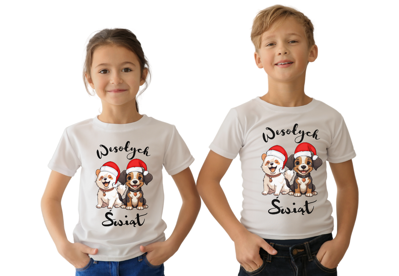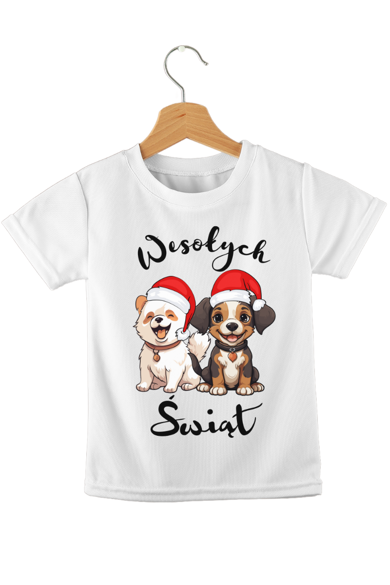 Koszulka dziecięca "Dwa Psy - Wesołych Świąt" to uroczy sposób na podkreślenie świątecznego nastroju. Zabawny nadruk z dwoma pieskami wprowadza radość i humor, doskonale oddając atmosferę świąt!