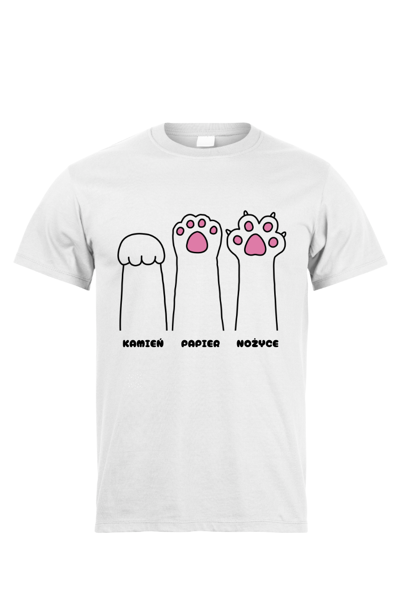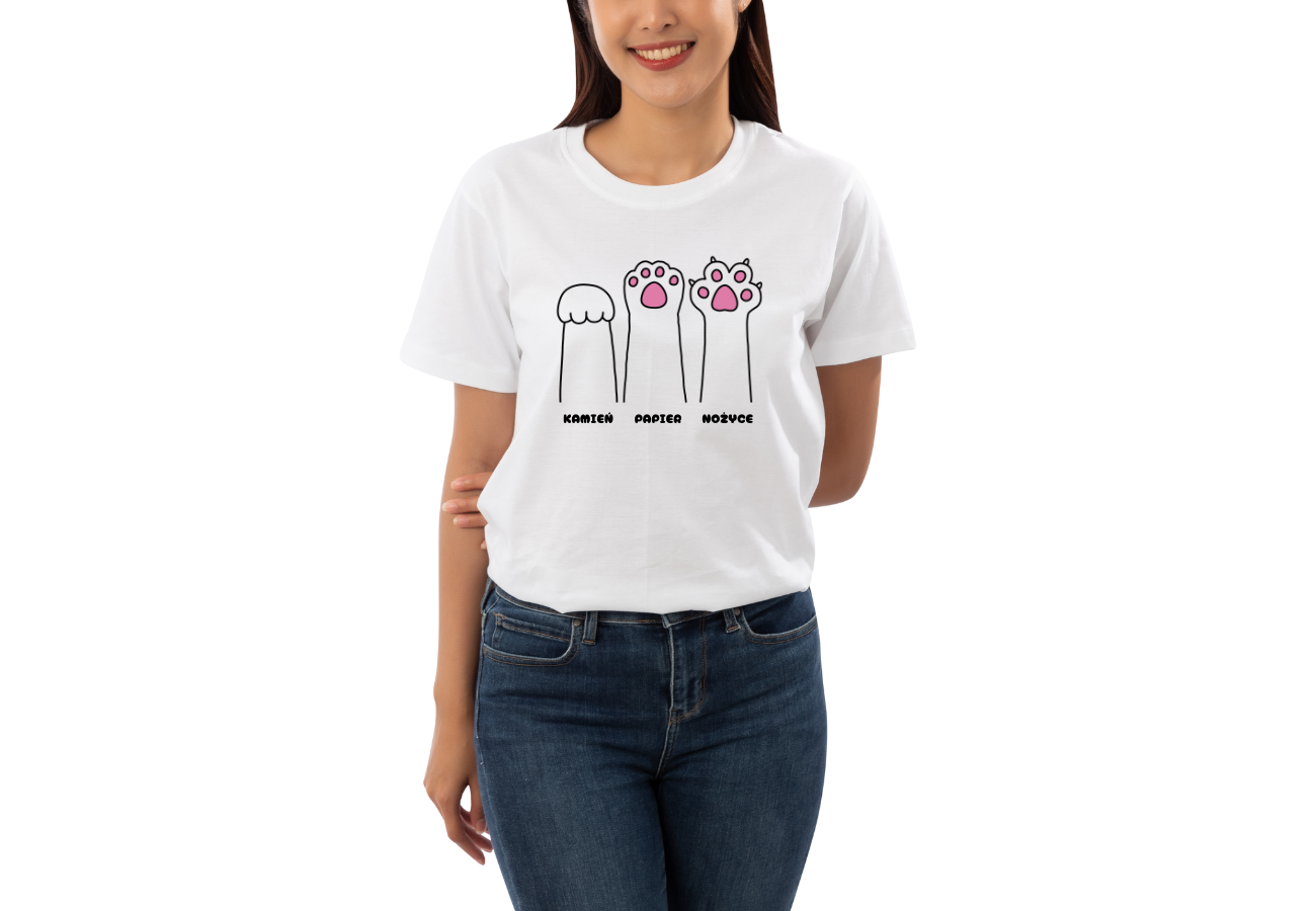Koszulka "Kocie Łapy Kamień, Papier, Nożyce" to kreatywna interpretacja znanej gry. Wybierz swój ruch z uroczymi kocimi łapkami i dodaj odrobinę humoru do swojego stylu. Zabawa zawsze w zasięgu twoich dłoni!