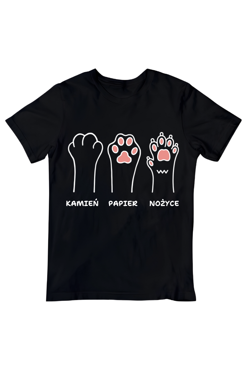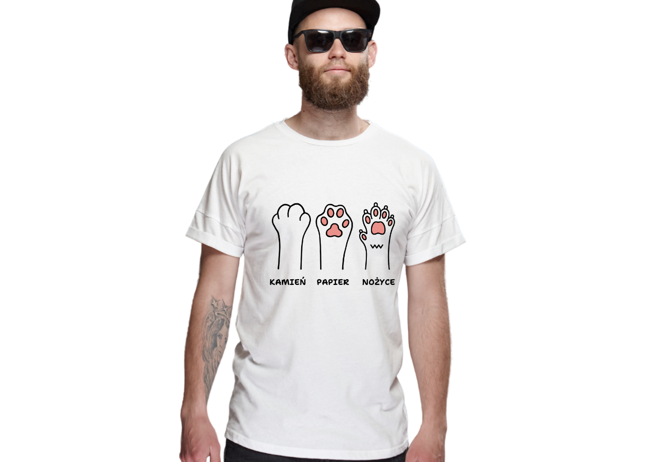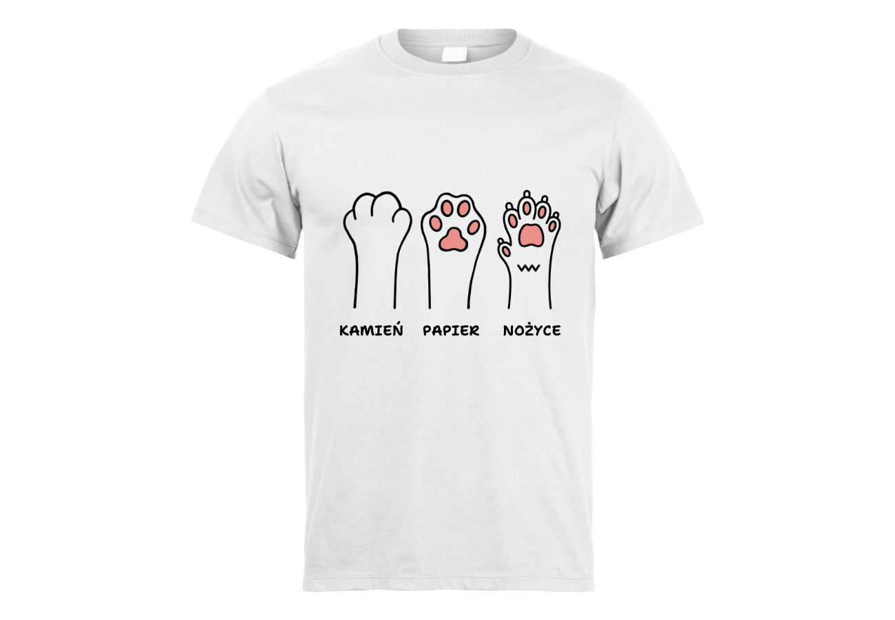 Koszulka "Łapki Psa Kamień, Papier, Nożyce" to twórcza wersja znanej gry. Wybierz swój ruch z uroczymi łapkami psa i dodaj nutkę humoru do swojego stylu. Zabawa zawsze w zasięgu twoich dłoni!