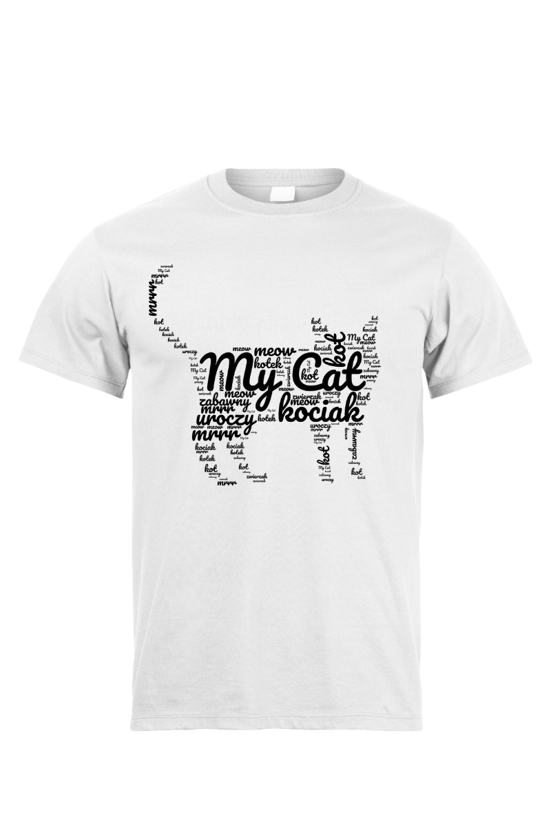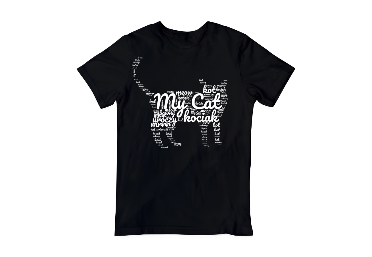 Koszulka "Mój Kot z Napisów" ukazuje zarys kota stworzony z napisów. To subtelna, a zarazem serdeczna deklaracja miłości do naszego futrzanego towarzysza. Grafika ta oddaje, że kot stanowi nieodłączną część naszego życia