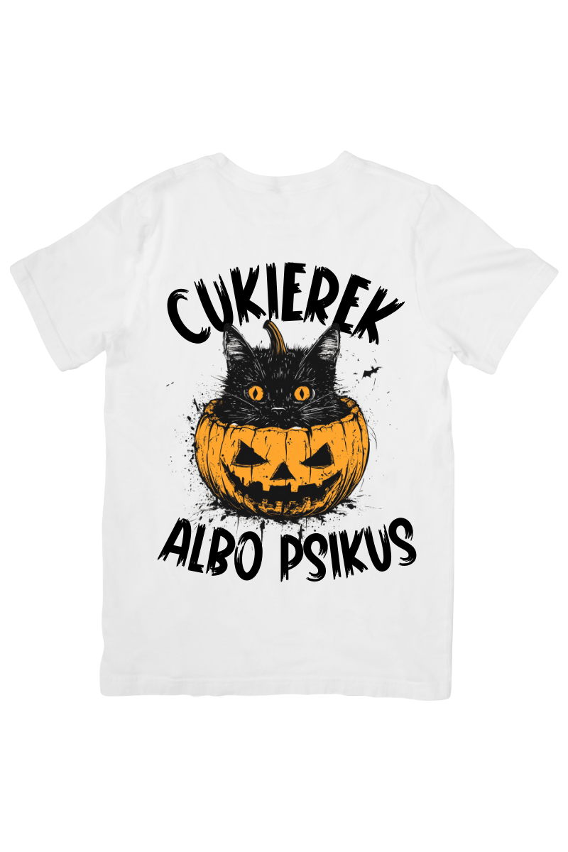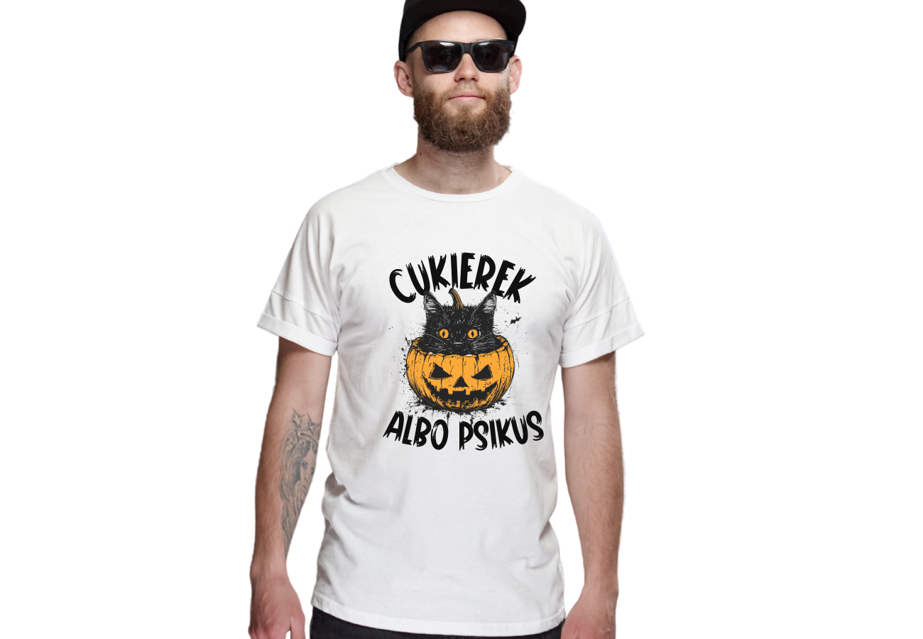 Koszulka "Cukierek Albo Psikus: Kot w Dyni" to uroczy i zabawny wybór na Halloween. Nadruk przedstawiający kota siedzącego w dyni wprowadza w klimatyczną atmosferę tego święta, idealny na halloweenowe imprezy czy jako stylowy dodatek do świątecznej zabawy.