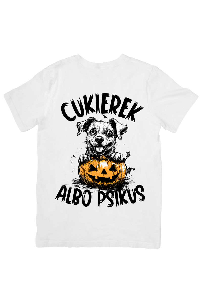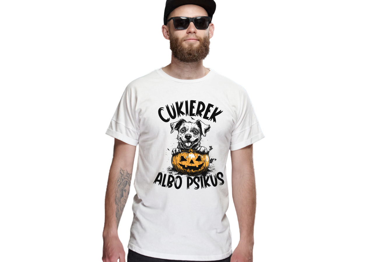 Koszulka "Cukierek Albo Psikus: Pies z Dynią" to idealny wybór na Halloween dla miłośników psów. Nadruk przedstawiający psa z dynią wprowadza w zabawny, świąteczny nastrój. Doskonała na halloweenowe imprezy lub jako oryginalny dodatek do świętowania w klimatycznym stylu!