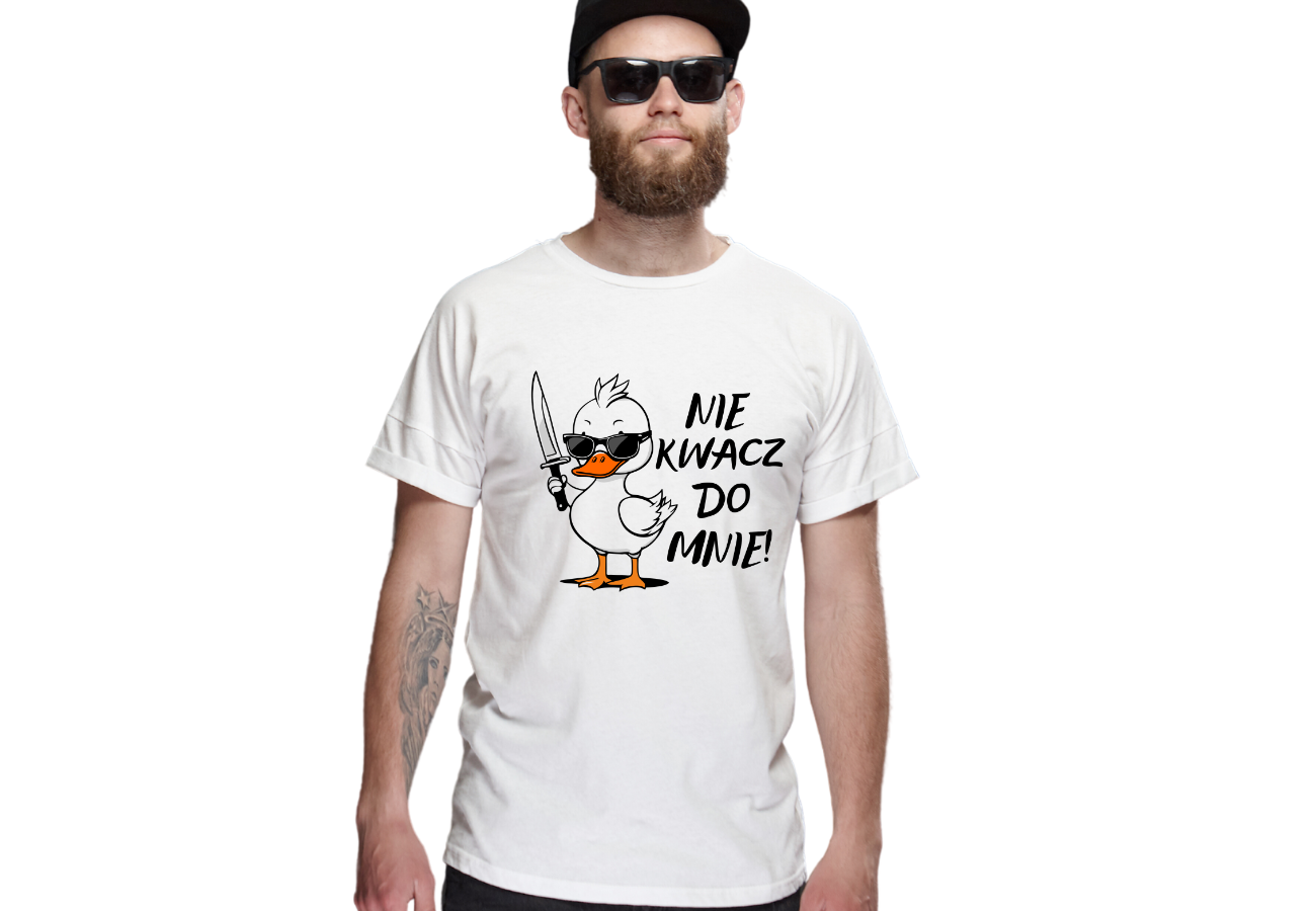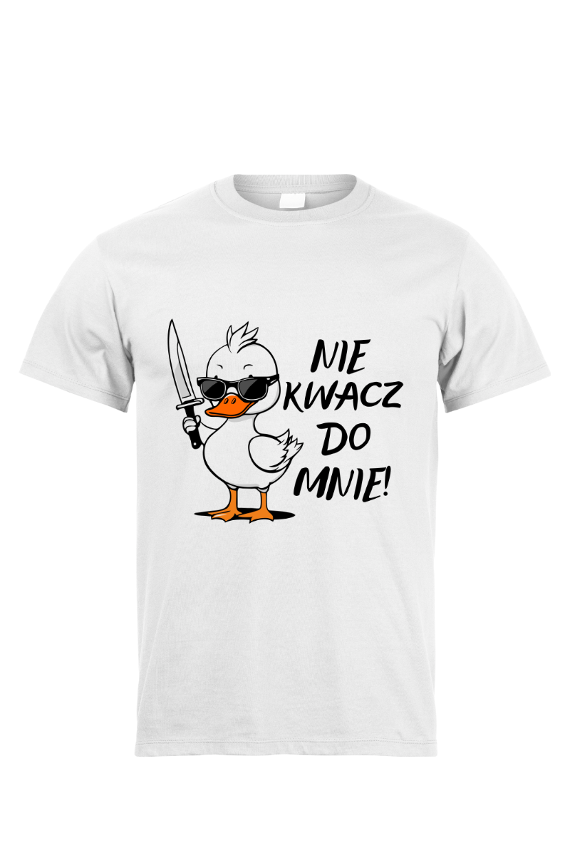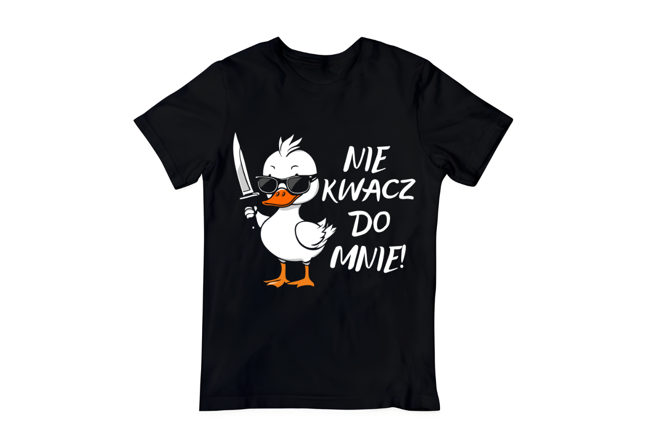 Ta koszulka to czysty humor z nutką ostrzejszego przekazu! Zabawna kaczka z nożem i napisem "Nie Kwacz Do Mnie" to wyrażenie Twojej niechęci do niechcianych rad. Pokaż swój ostry dowcip nosząc tę koszulkę!