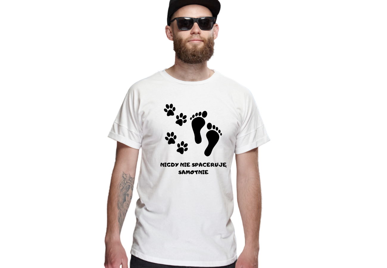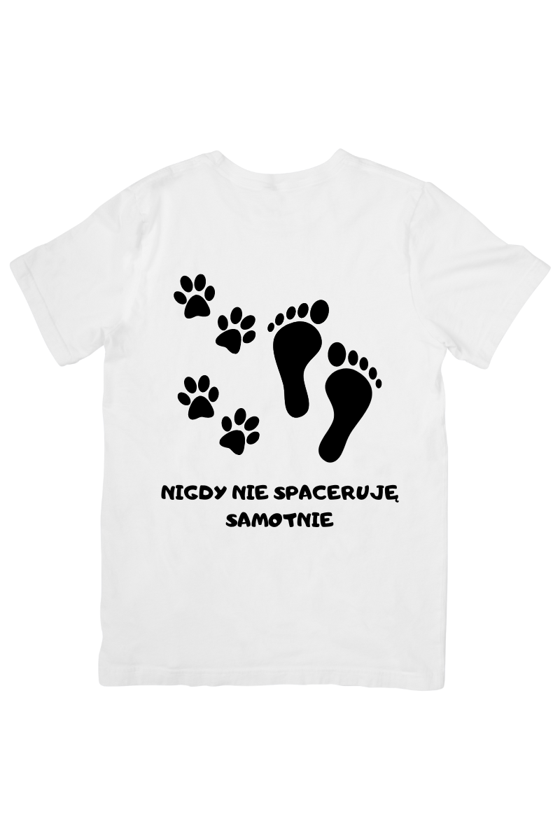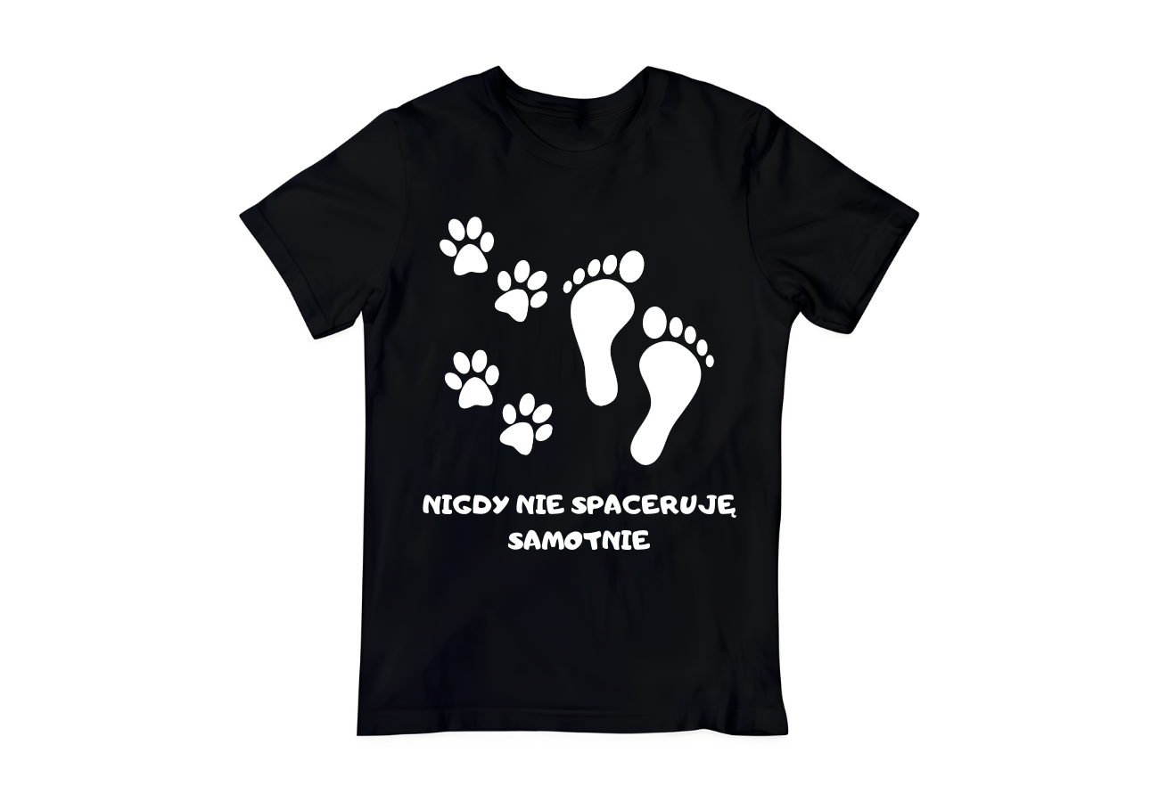 Koszulka "Nigdy Nie Spaceruję Samotnie" to idealna propozycja dla miłośników spacerów z pupilem. Dzięki zabawnemu nadrukowi, podkreślisz swoją więź ze swoim czworonożnym przyjacielem. Spaceruj stylowo i z uśmiechem!