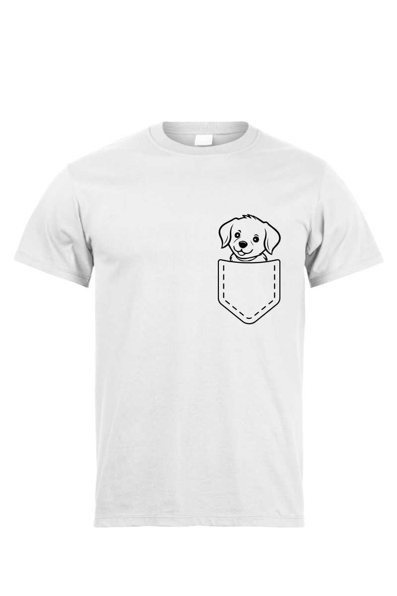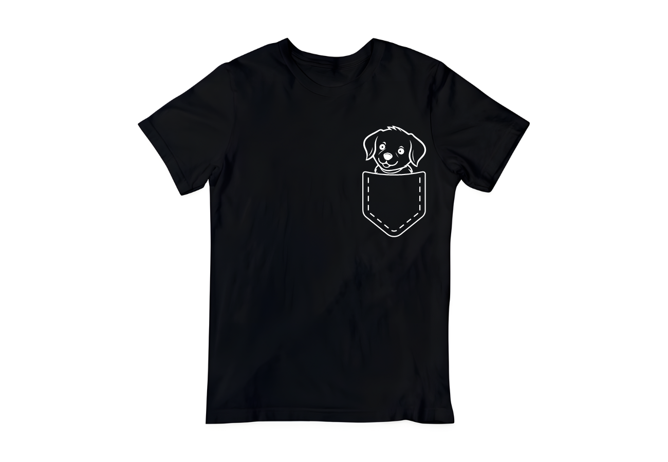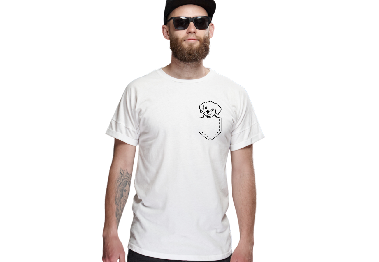 Koszulka "Pies w Kieszeni" to niezwykła dawka słodyczy i humoru! Z uroczym wizerunkiem psa, który towarzyszy Ci wszędzie, podkreślasz swoją miłość do czworonogów w oryginalny sposób.