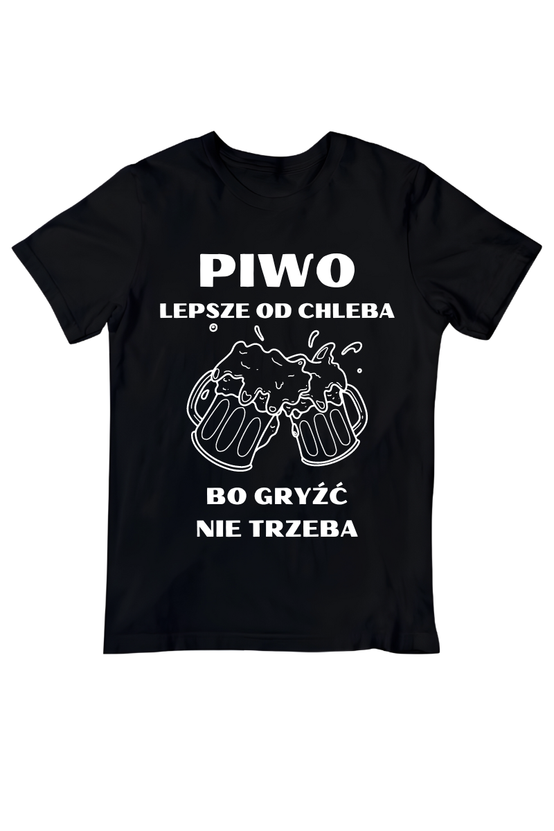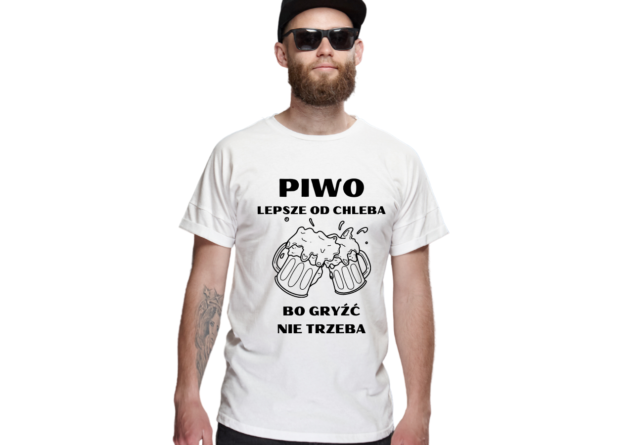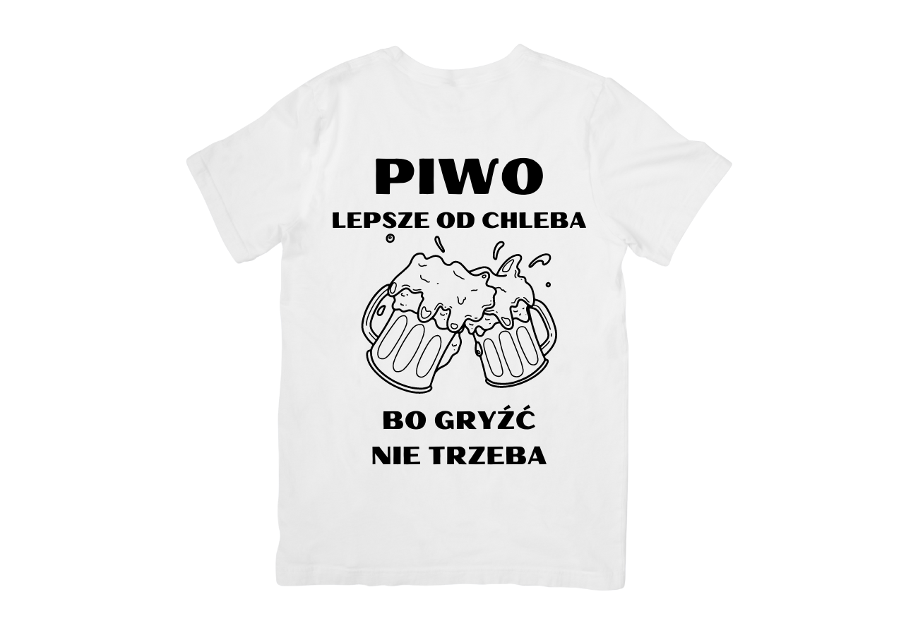 Koszulka "Piwo Lepsze od Chleba Bo Gryźć Nie Trzeba" to humorystyczny akcent dla każdego piwosza! Doskonała na luźne spotkania czy imprezy, podkreśla Twoje zamiłowanie do piwa w lekkim, żartobliwym stylu.