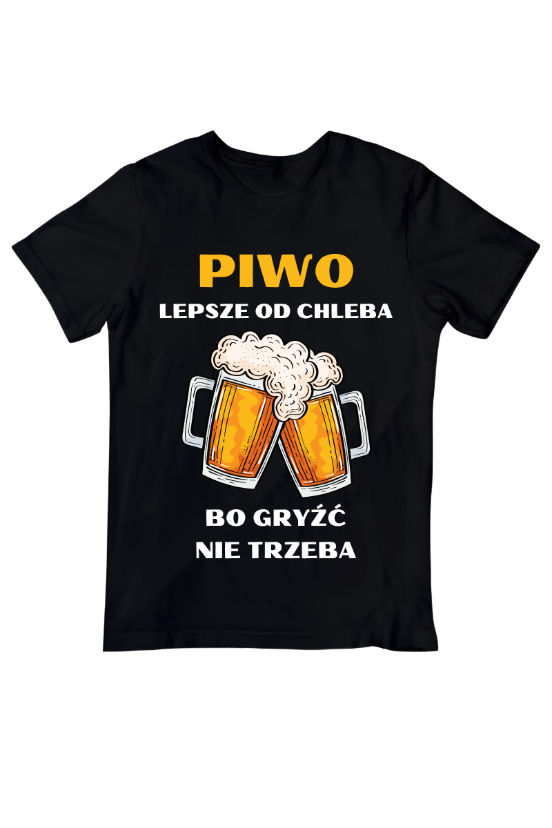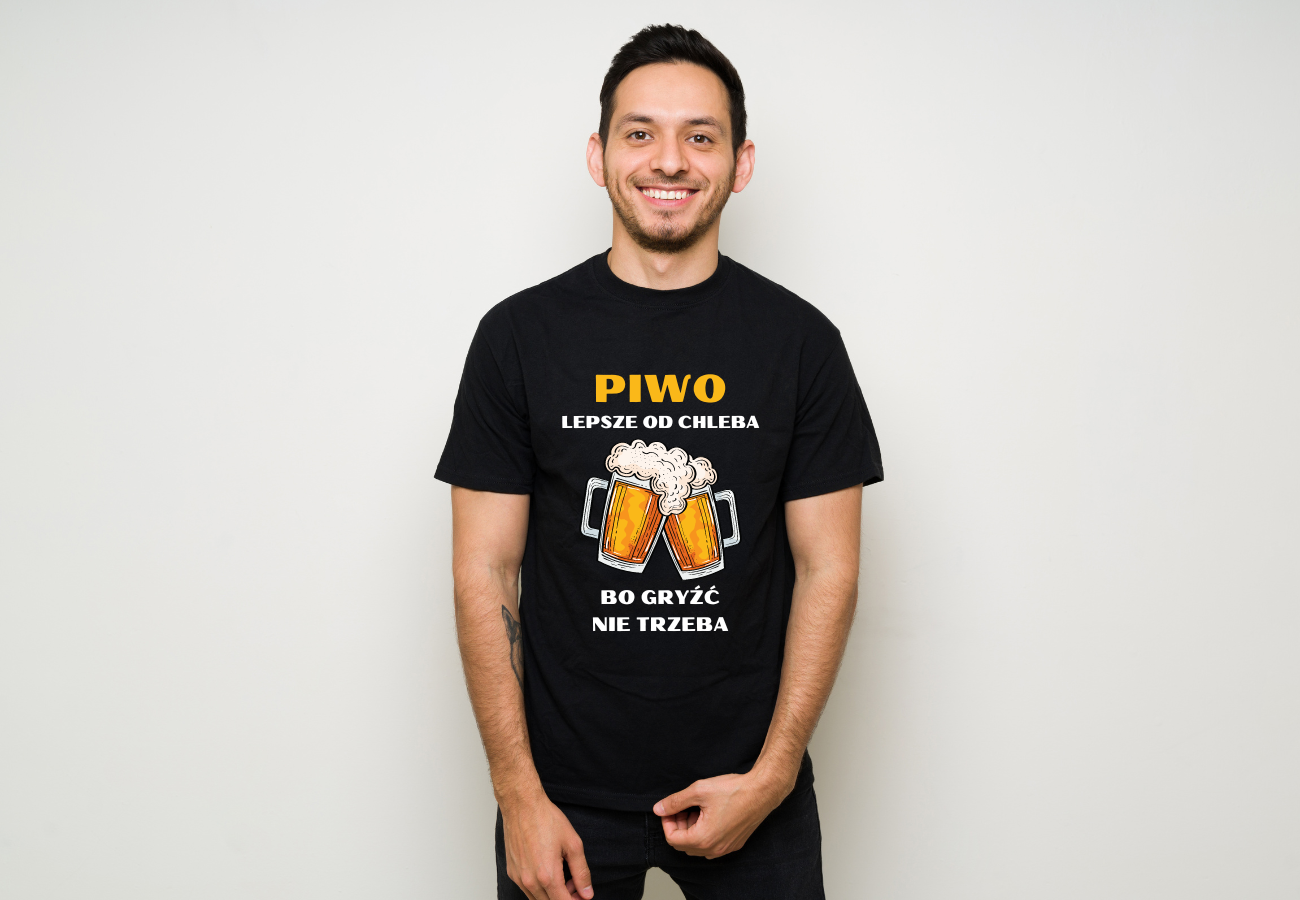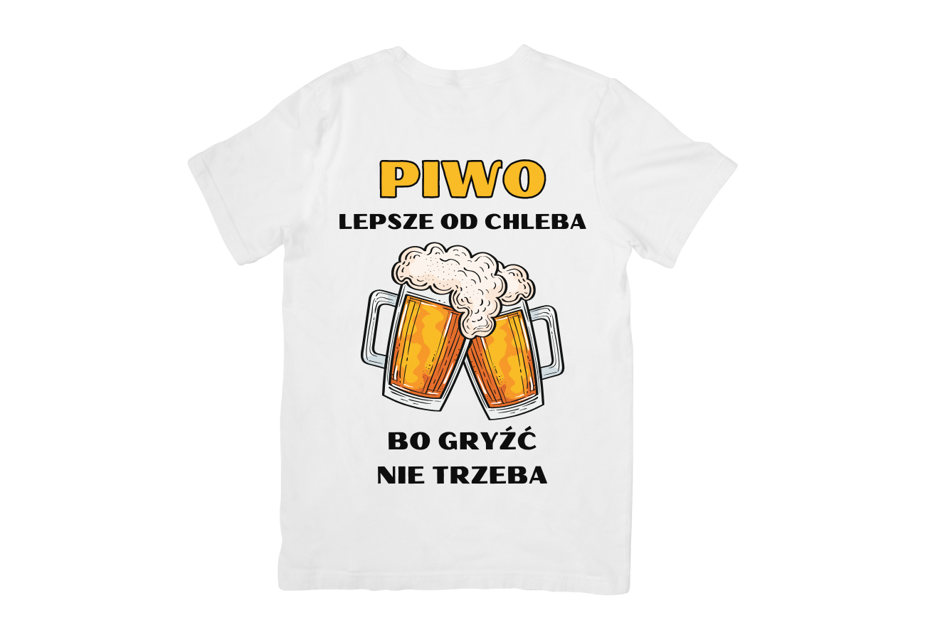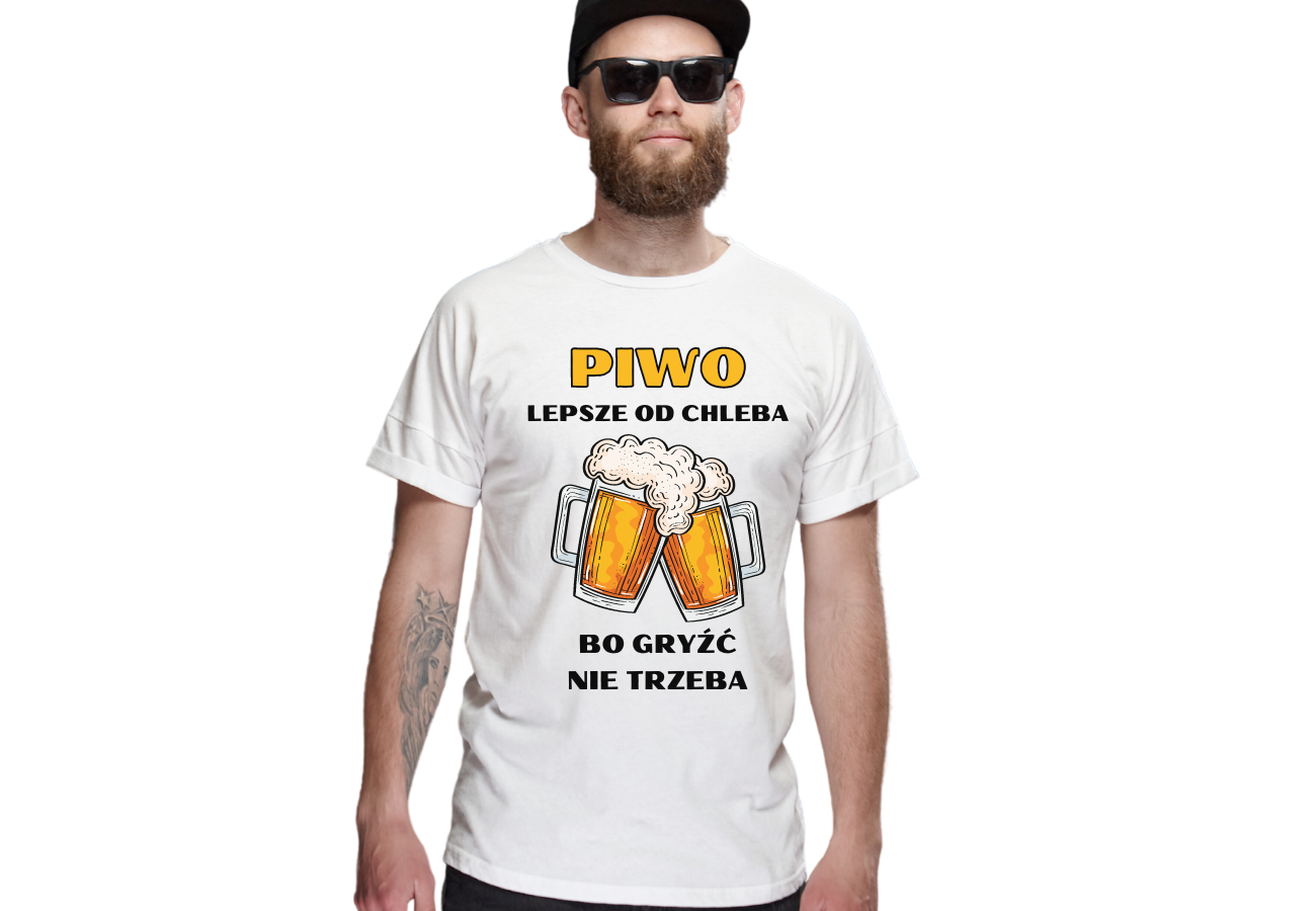Koszulka "Piwo Lepsze od Chleba Bo Gryźć Nie Trzeba" to humorystyczny akcent dla każdego piwosza! Doskonała na luźne spotkania czy imprezy, podkreśla Twoje zamiłowanie do piwa w lekkim, żartobliwym stylu.