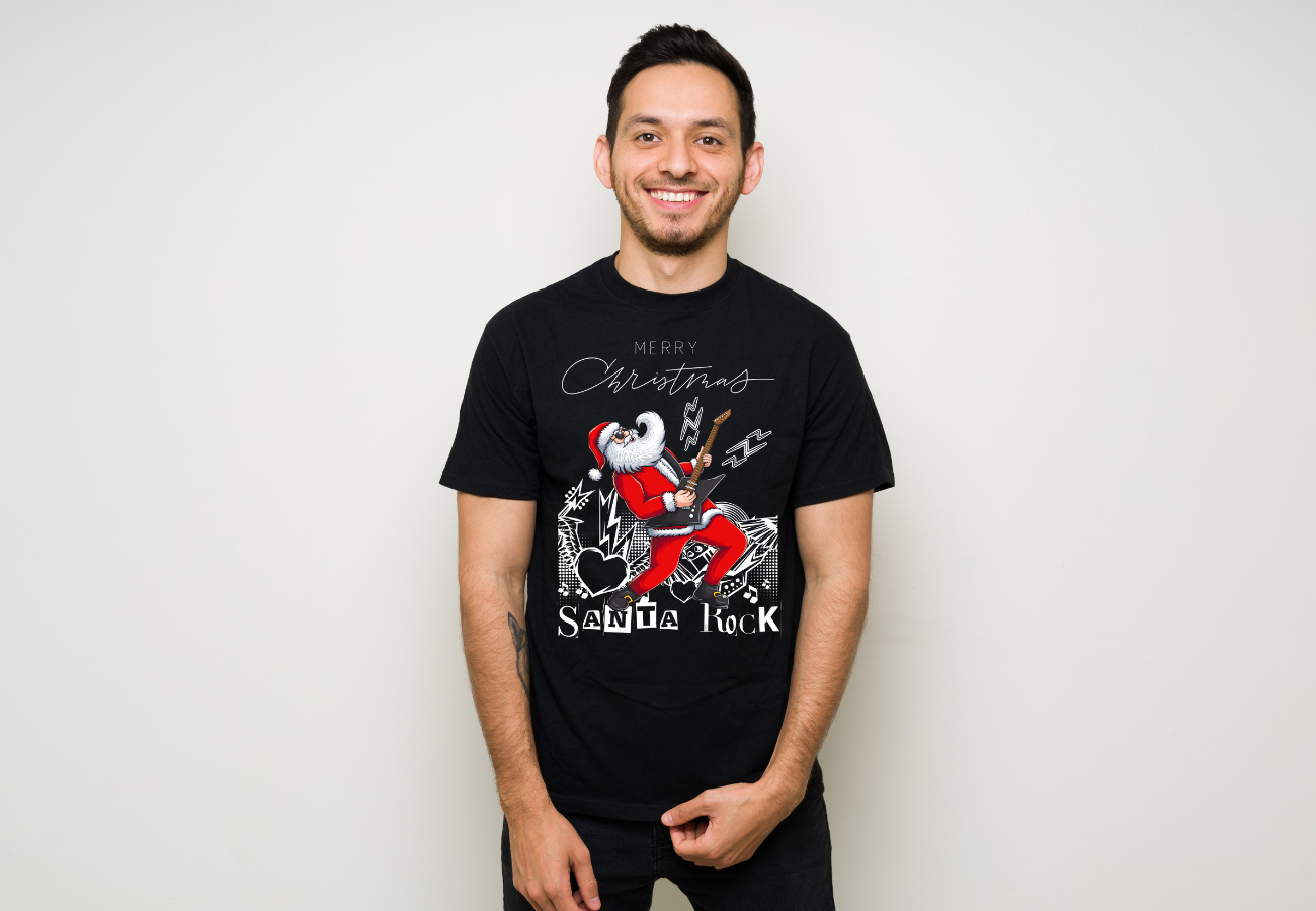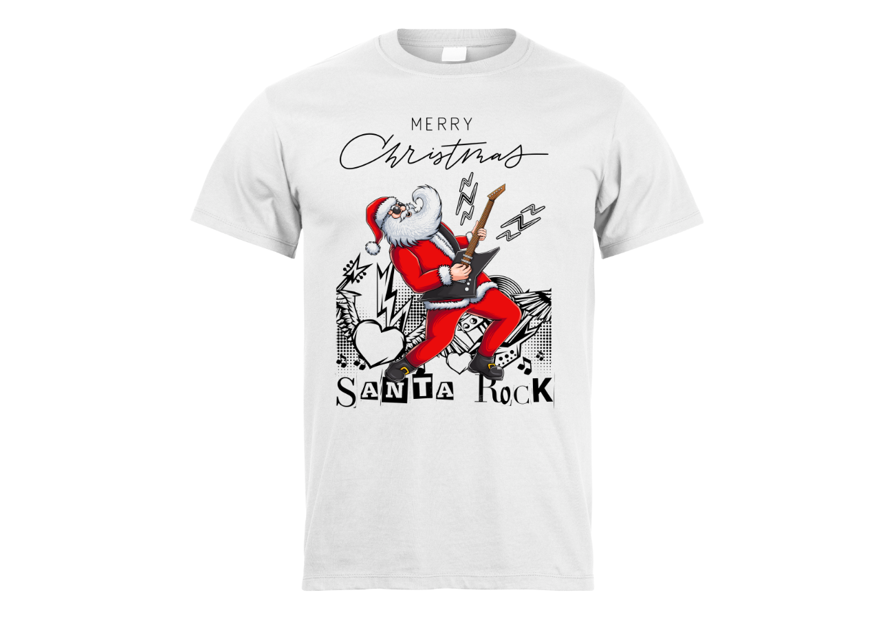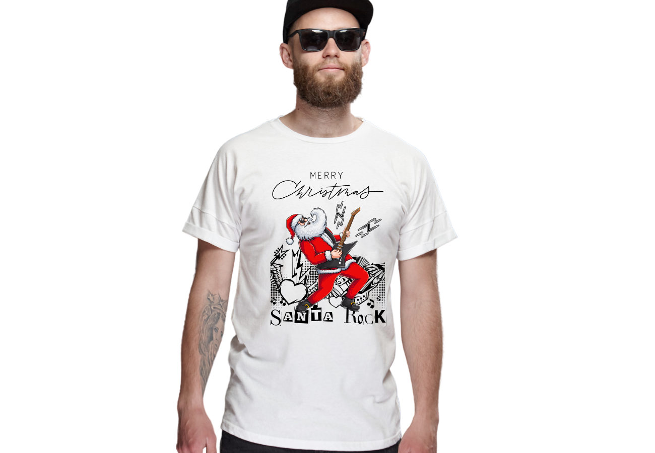 Koszulka "Wesołych Świąt - Santa Rock" to wyraz radości i nieco szalonej atmosfery świąt Bożego Narodzenia. Ta koszulka przedstawia Świętego Mikołaja w rockowym wydaniu, dodając świątecznym przygotowaniom odrobinę rockowej zadziorności. To ubranie, które wyraża Twoje podejście do świąt w unikalny sposób, pełen wigoru i świątecznej magii.