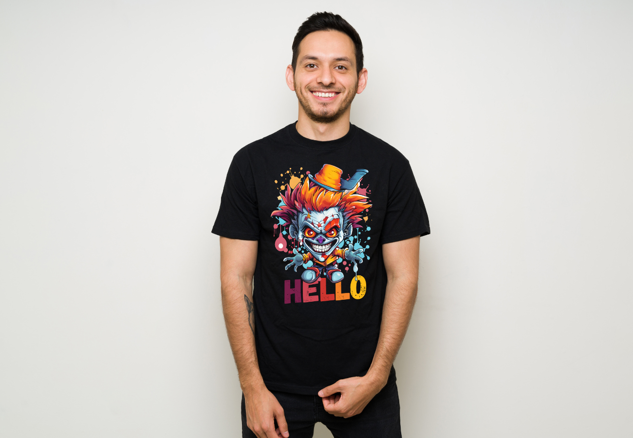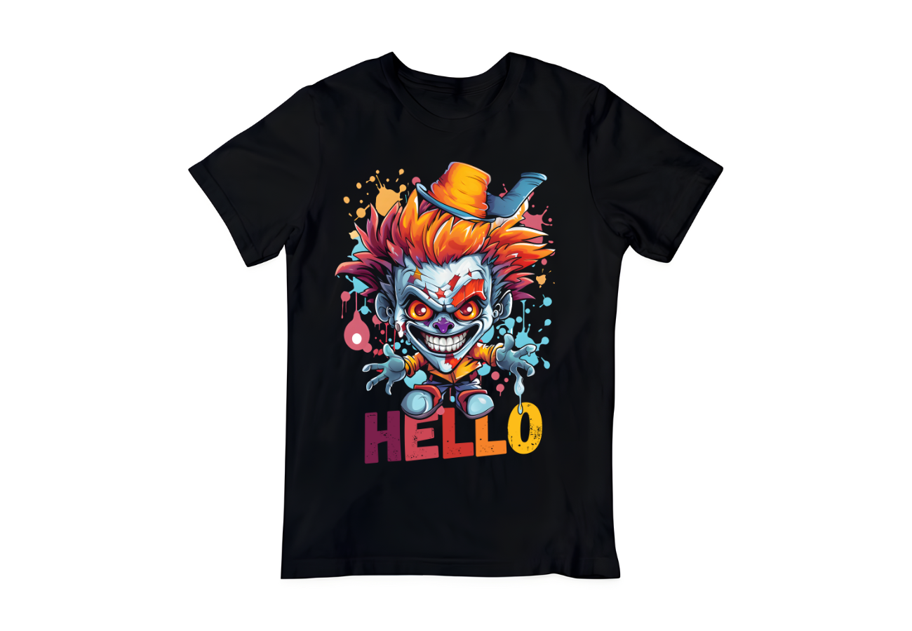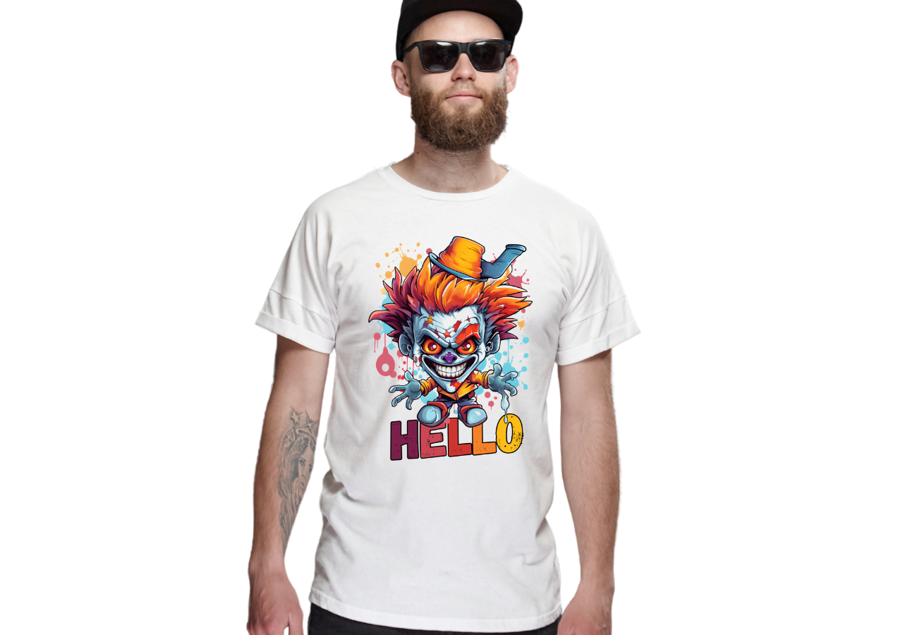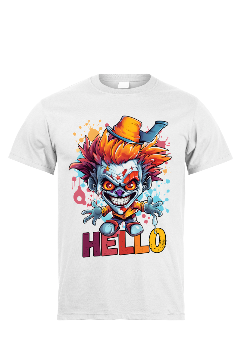 Witaj w krainie humoru i tajemniczości! Ta koszulka przedstawia zabawnego klauna, który mimo tajemniczego wyrazu na twarzy wita Cię słowem "Hello". To doskonały wybór dla tych, którzy cenią sobie mieszankę śmiechu i nieco intrygującego klimatu. Odkryj ten niezwykły świat, ubierając tę koszulkę i dodając nieco uroku i zagadki do swojej codzienności!